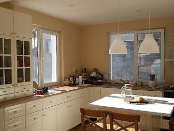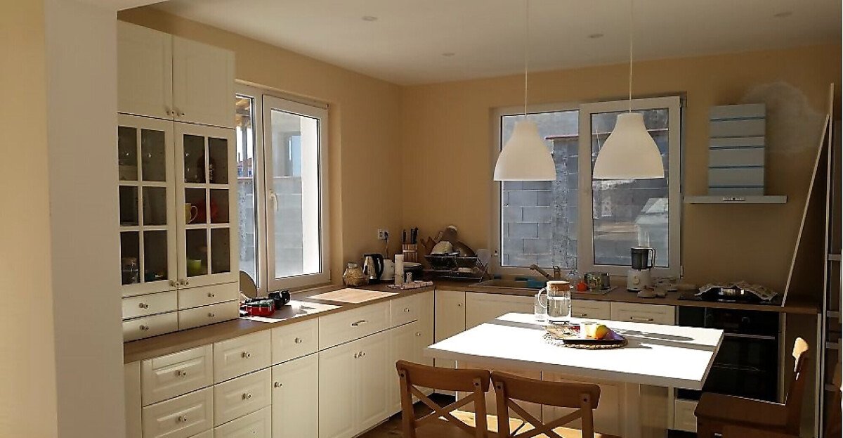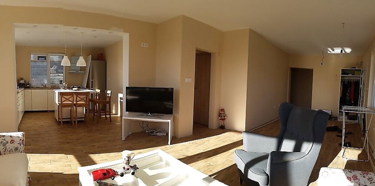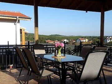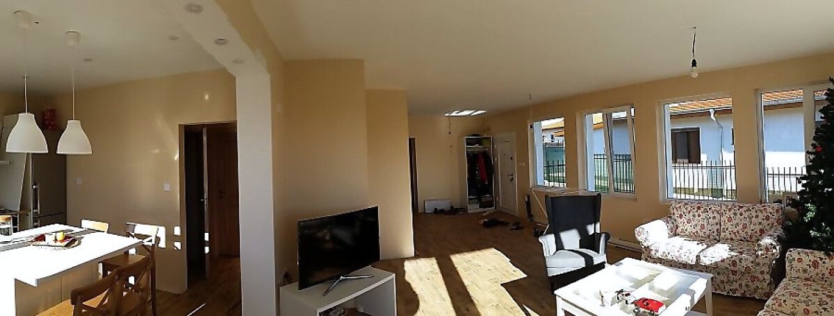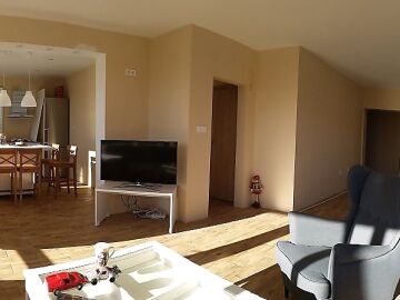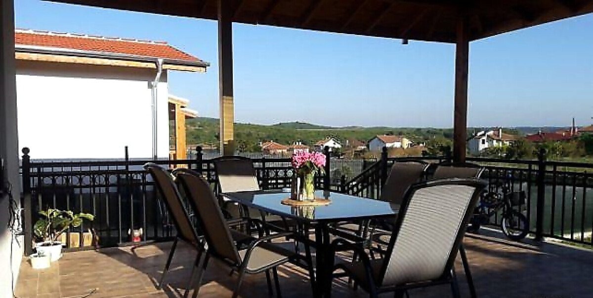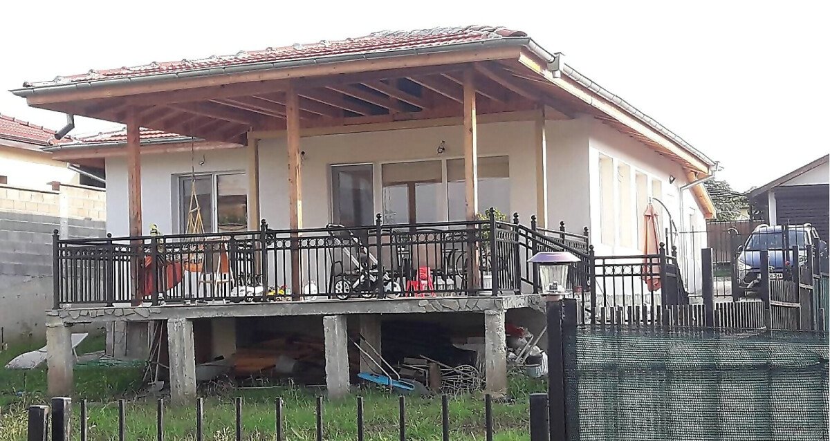 Къщата разполага с голяма всекидневна с кухня, три отделни спални, две бани, мокро помещение и невероятна веранда с площ от 40 кв.м. Верандата е оборудвана с маса и столове, а гледката, която се разкрива от там е забележителна.