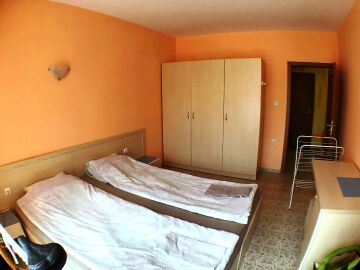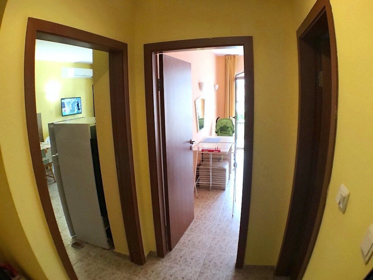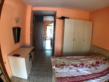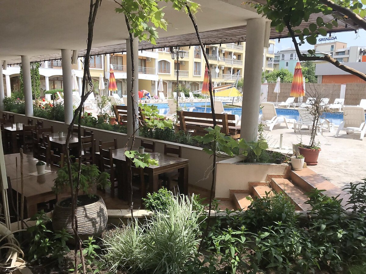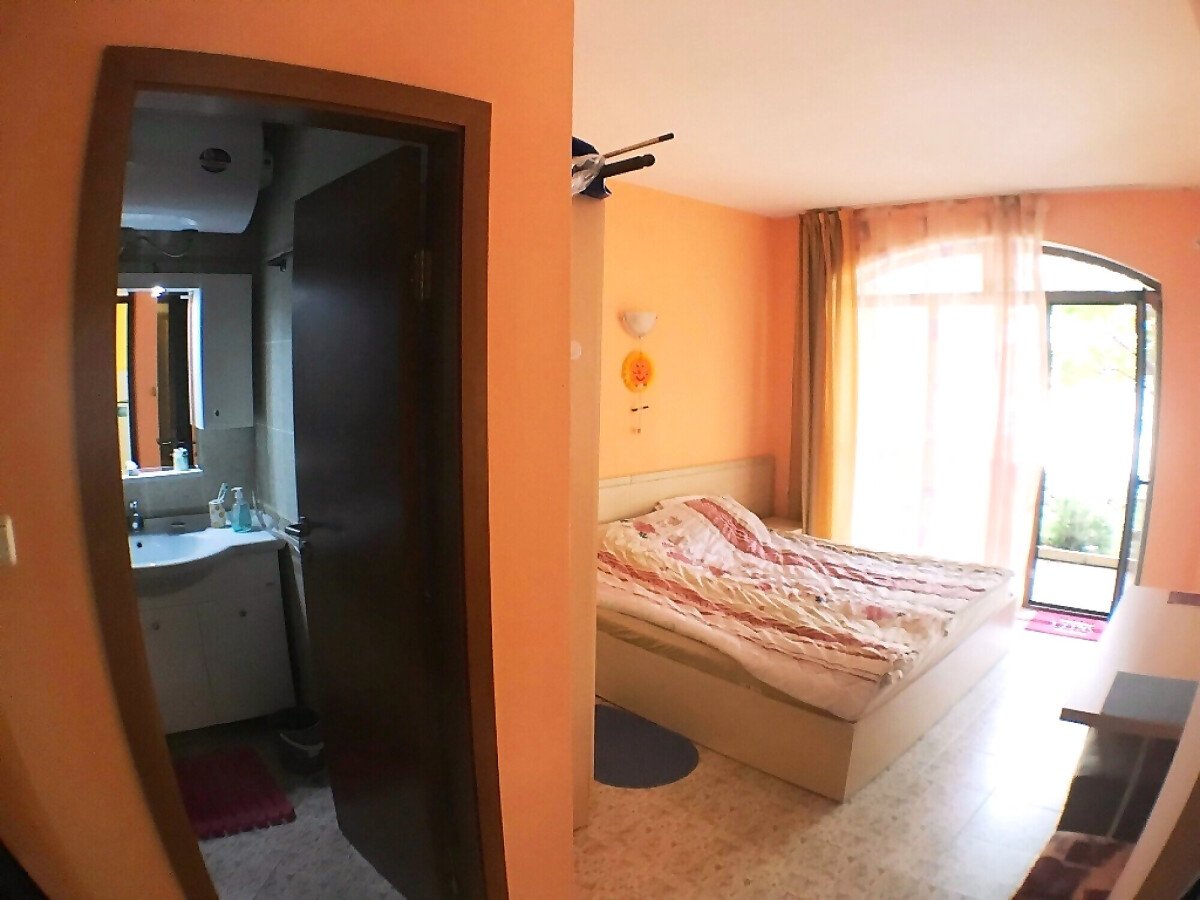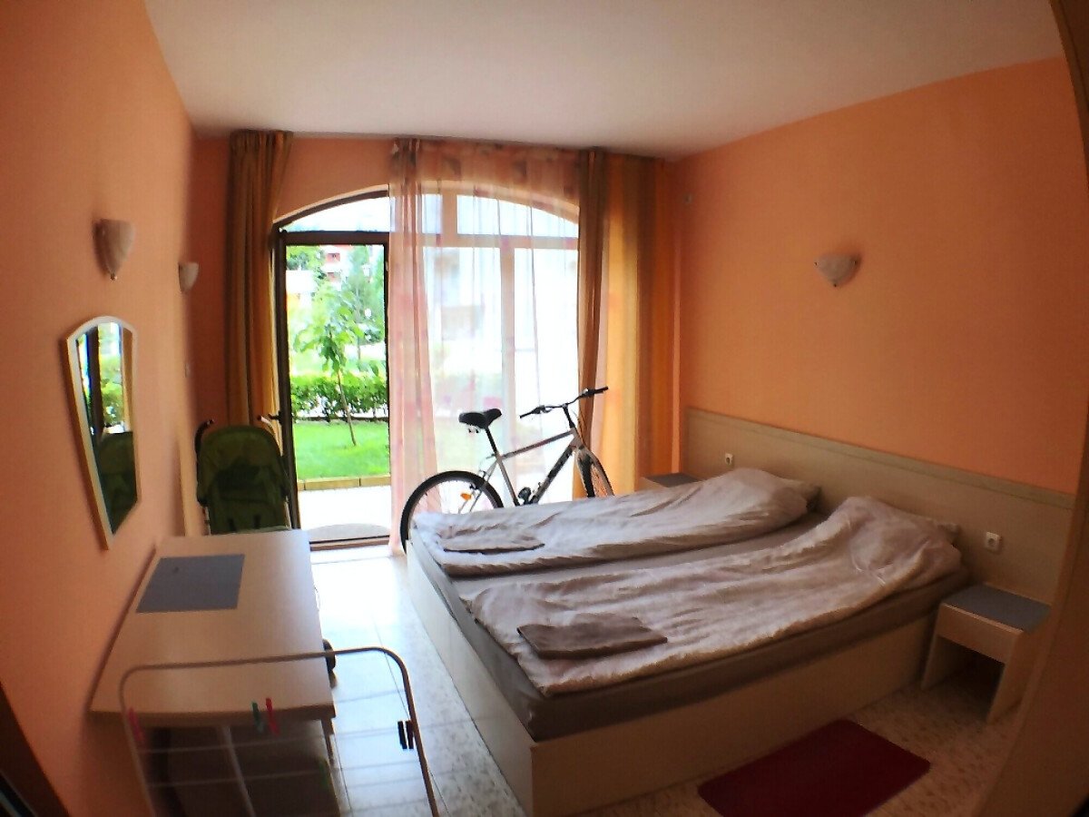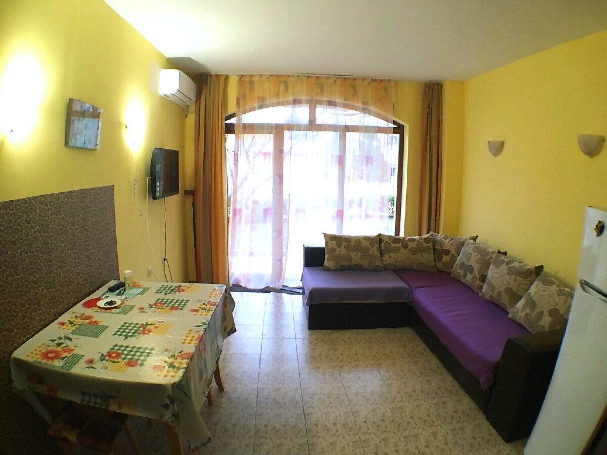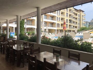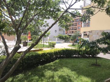 Апартаментът е с източно изложение и разкрива гледки към басейна и двора на комплекса.