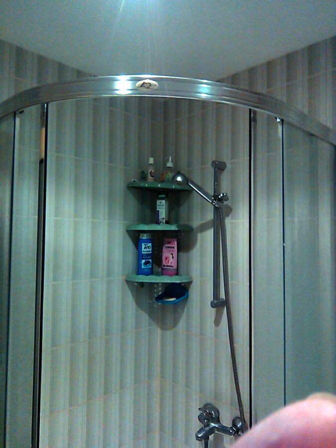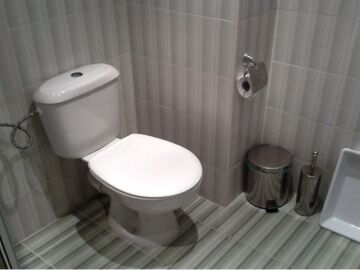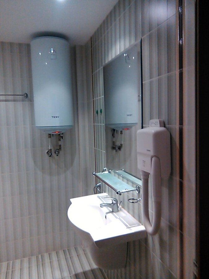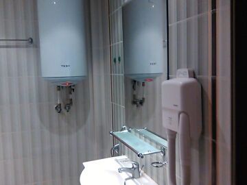 Банята е с душ кабина, мивка с огледало, сешоар.