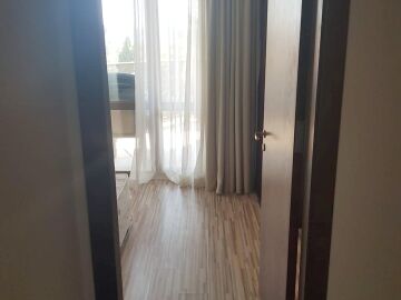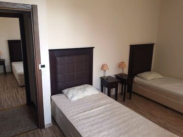 Апартаментът е обзаведен и се състои от коридор, дневна с кухня, две спални, две бани и разкошна тераса.