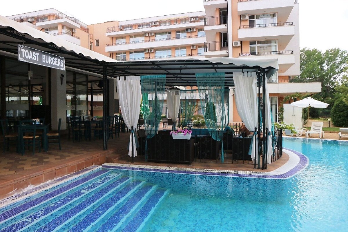 На територията на комплекса са осигурени всички условия за комфортна и спокойна почивка – има четири плувни басейна – два за възрастни и два за деца, воден бар, ресторант, тенис корт, детска площадка и др.