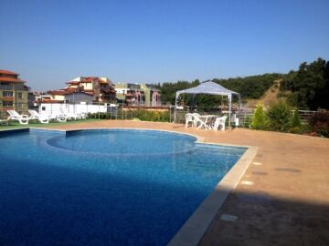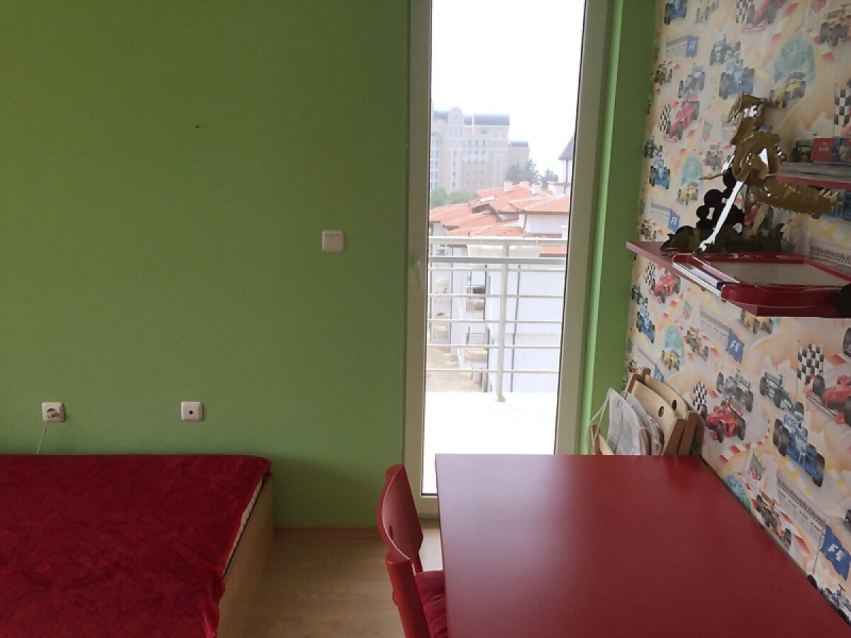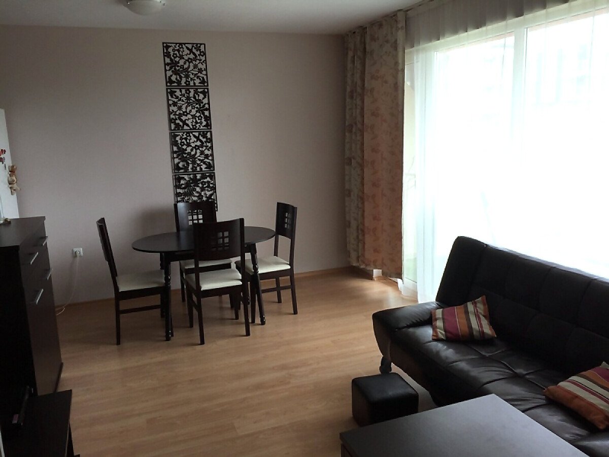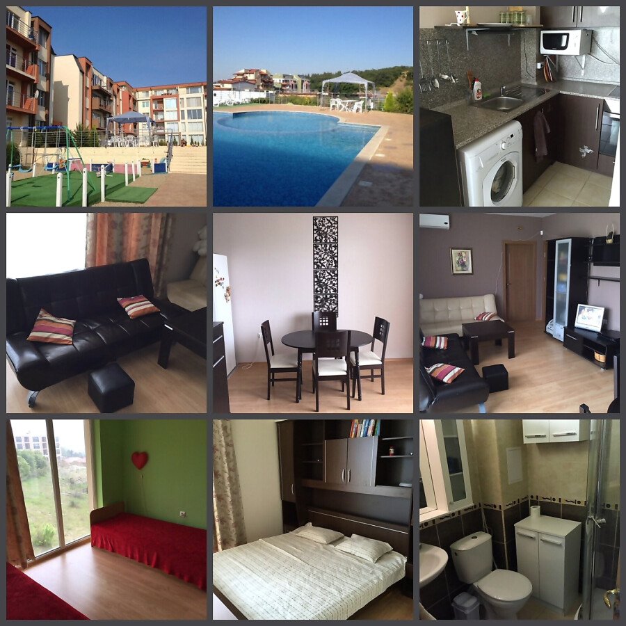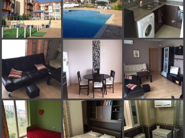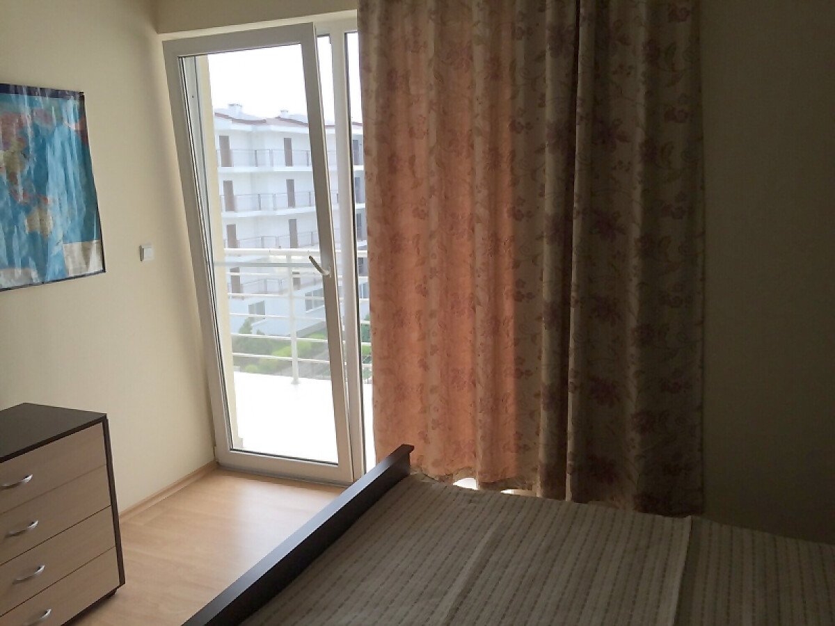 Жилището е разположено на 2-ри етаж, напълно обзаведено е, а прозорците са с изглед към прекрасен басейн.