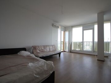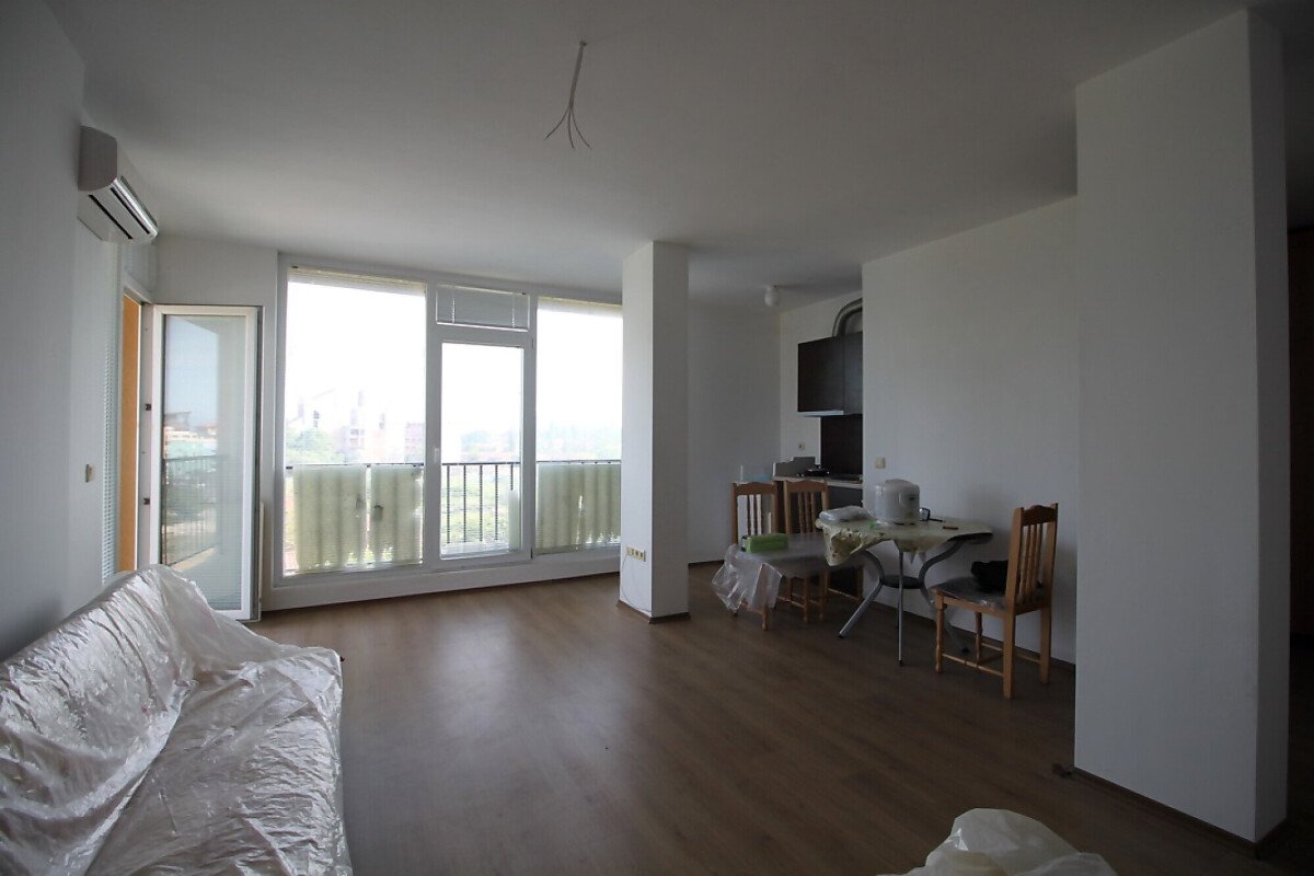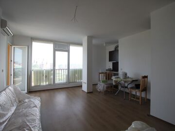 Студиото е с площ 52 кв.м, предлага се обзаведено и има красиви панорамни прозорци с гледка към курорта.
