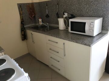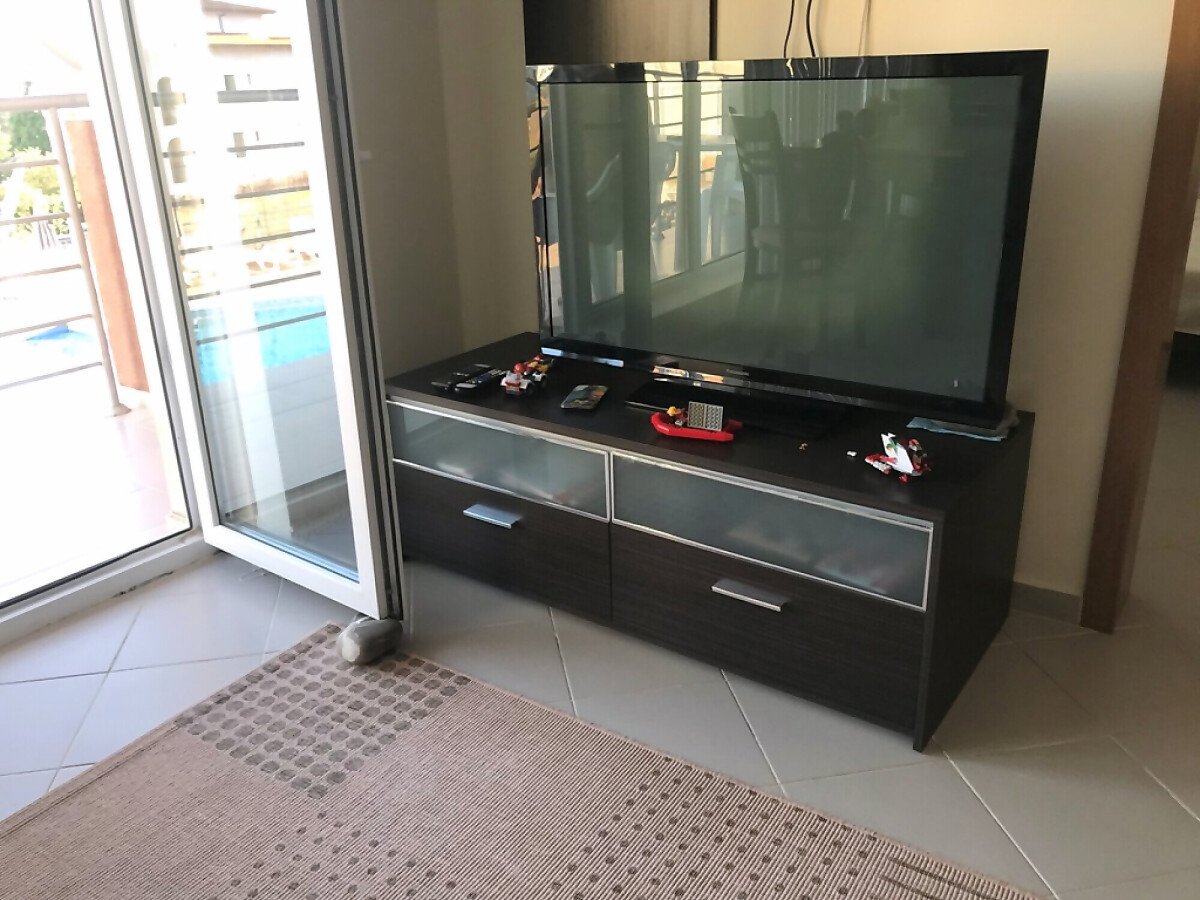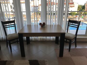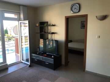 Апартаментът е с площ от 70 кв.м и е на втория етаж. Състои се от дневна с кухня, 2 спални, баня с вана и тоалетна и тераса с изглед към басейна на комплекса.