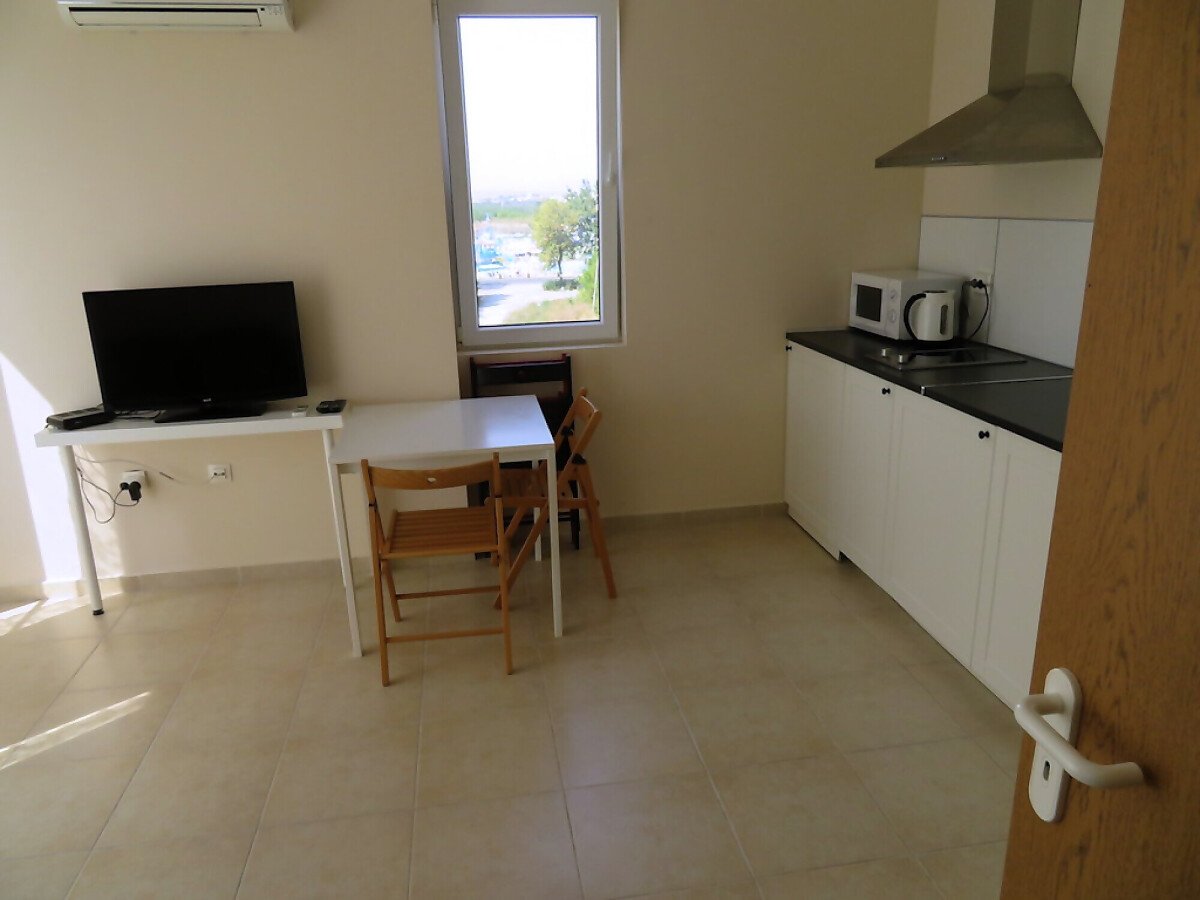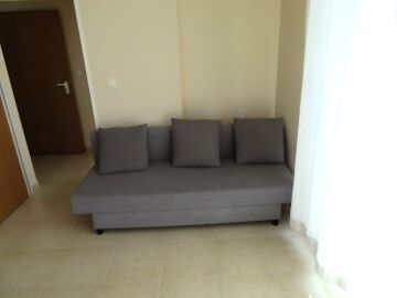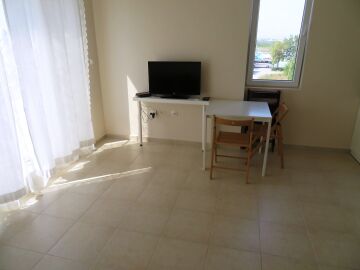 Апартаментът е двустаен, площта му е 62,17 кв.м и се предлага напълно обзаведен. Състои се от дневна с кухня, една спалня, баня с тоалетна и разкошна просторна тераса, на която можете да правите слънчеви бани.