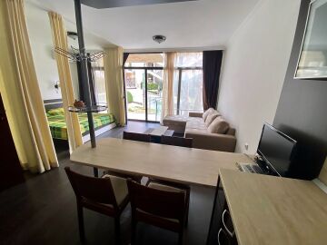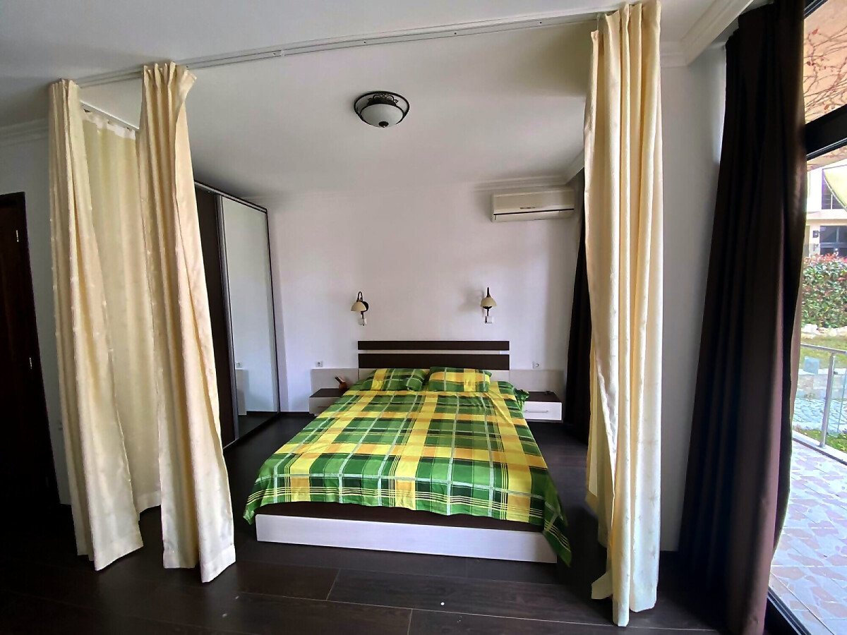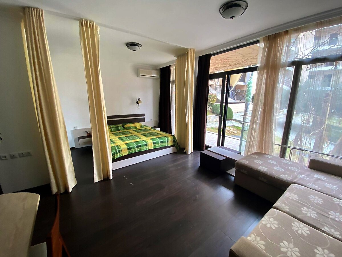 Студиото е просторно, може да се преобразува в малък двустаен апартамент. В момента спалнята е леко отделена с пердета. Към студиото има прекрасна веранда от която се открива гледка към басейна и морето.