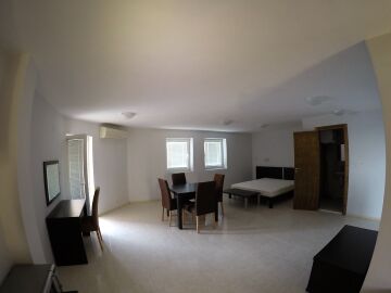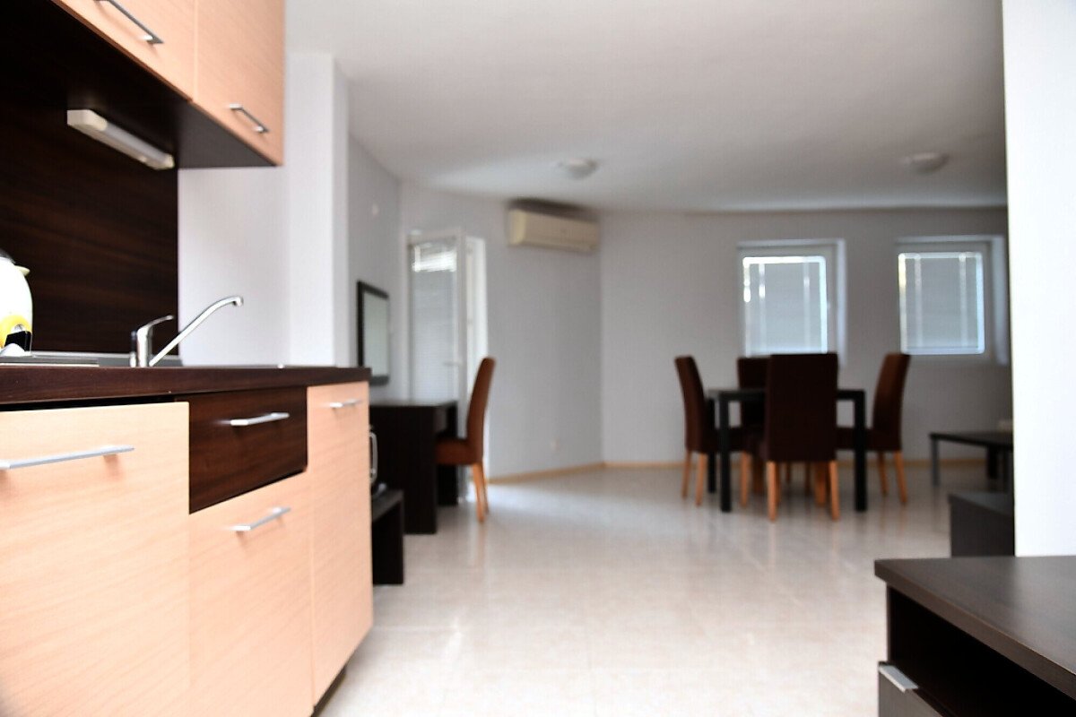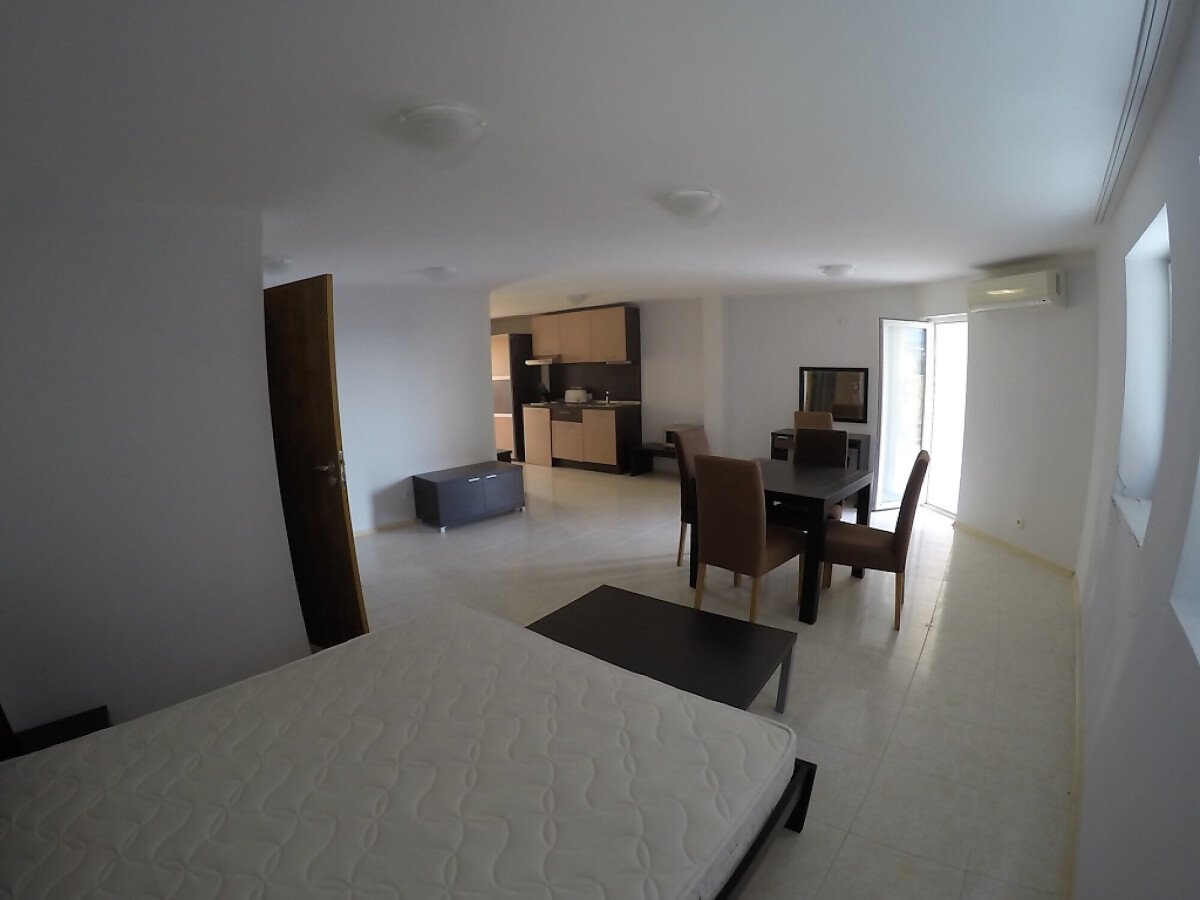 Ателието е напълно обзаведено, състои се от една стая с оборудван кухненски бокс и спалня, 1 баня и тераса с гледка към морето и улицата. Намира се на 2 етаж и се простира на 50 м2. Към апартамента спадат и 15.53 общи части. Общата площ на апартамента е 65.53 м2.