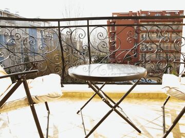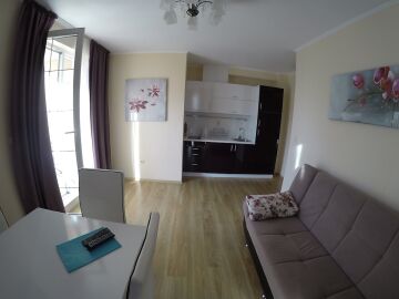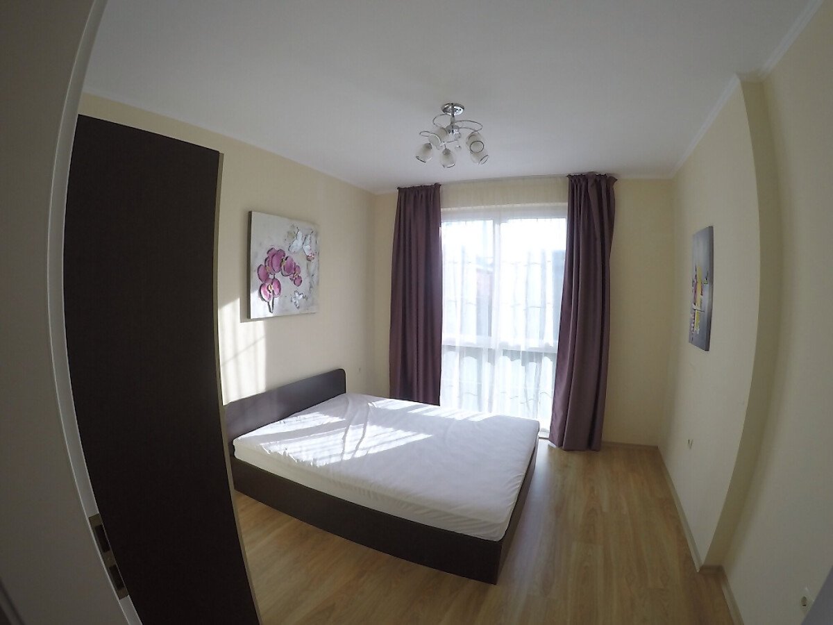 Апартаментът се намира на 4-ти етаж и се простира на 52м2. Напълно обзаведен и се състои от хол с кухненски бокс, спалня, баня и тераса с гледка към градината.
