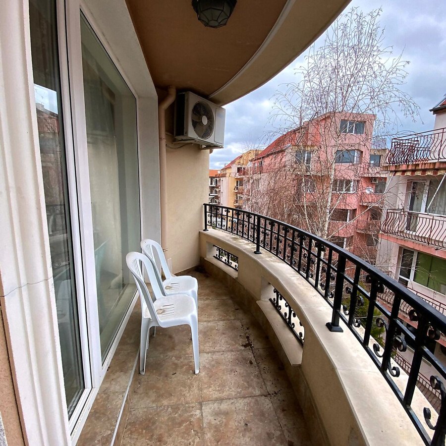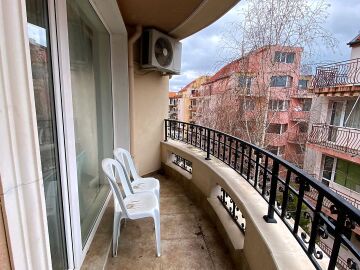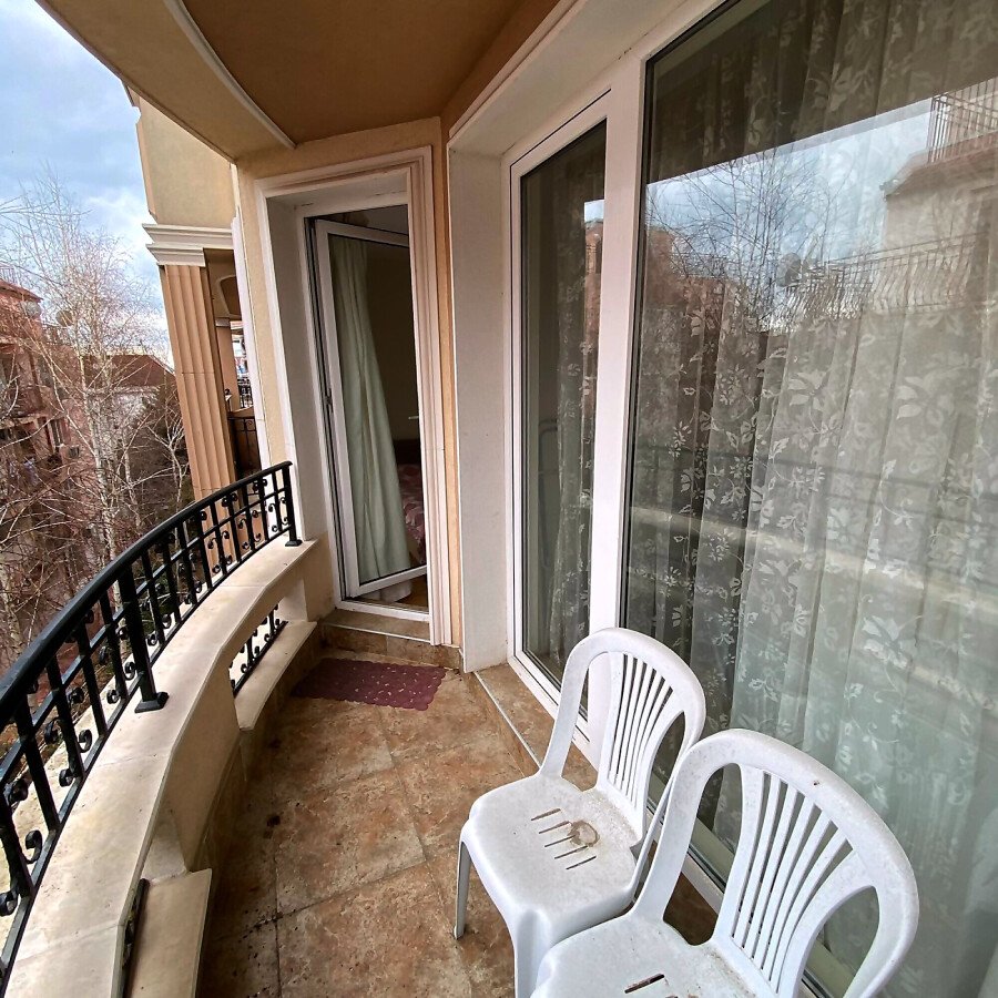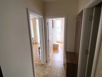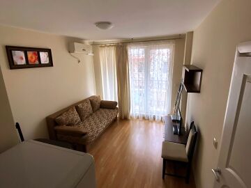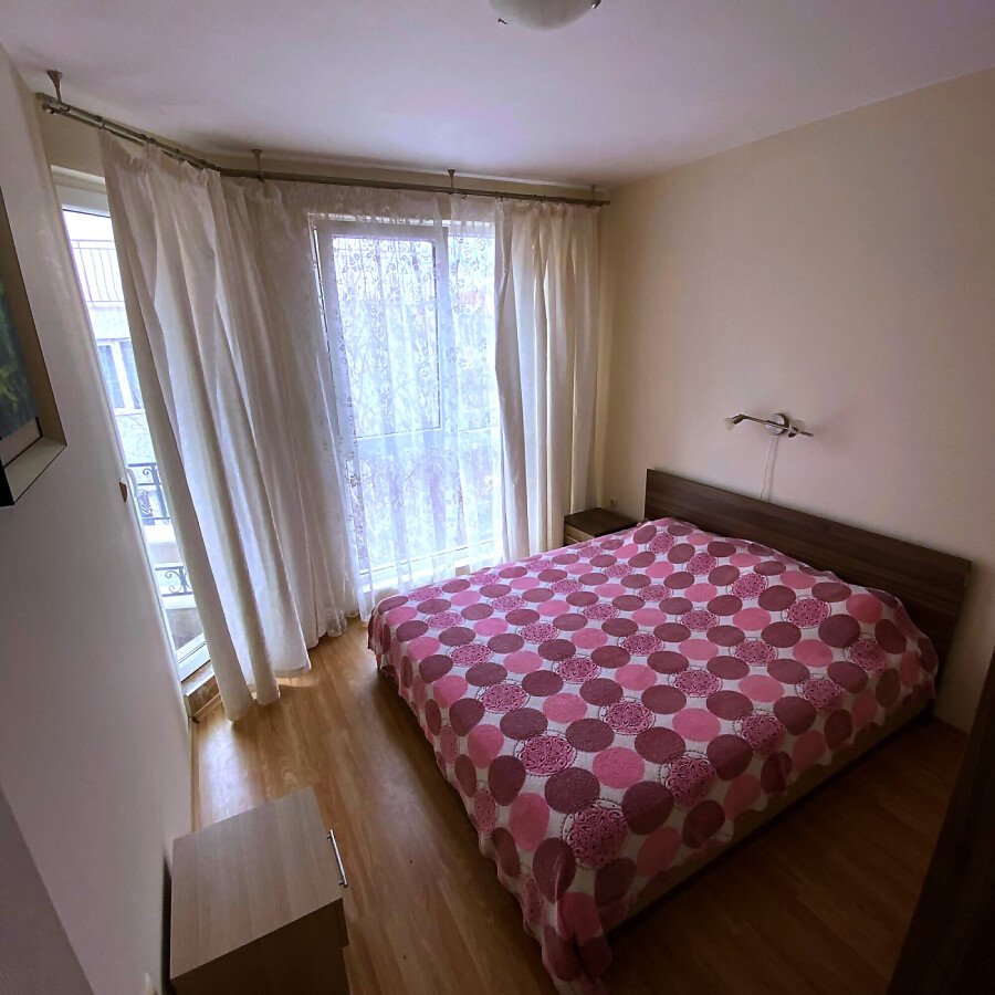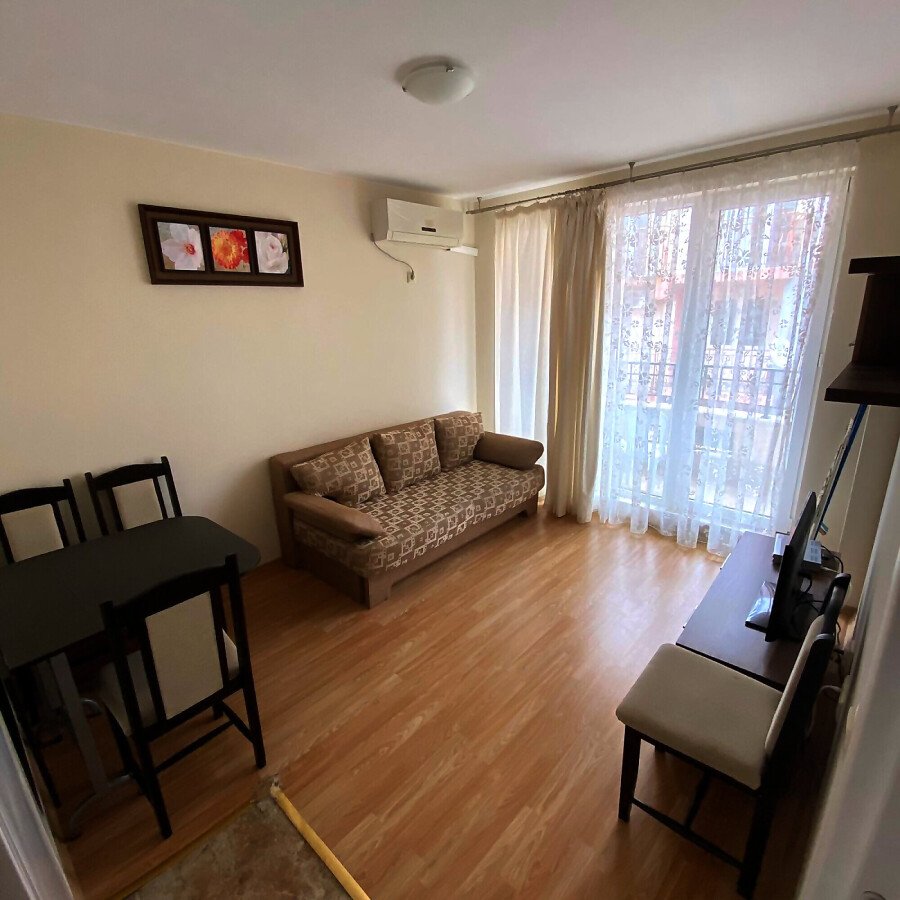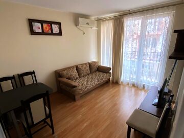 Апартамента, който Ви предлагаме се намира на 4-ти етаж и е с площ от 51 м2. Напълно обзаведен в модерен стил и оборудван, състои се от хол с кухня, баня, една спалня и просторна тераса с гледка към градината и детската площадка на комплекса.