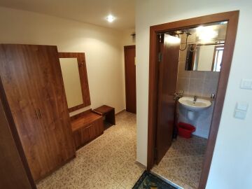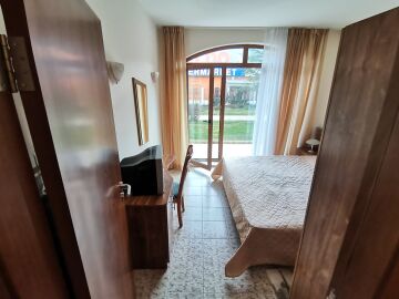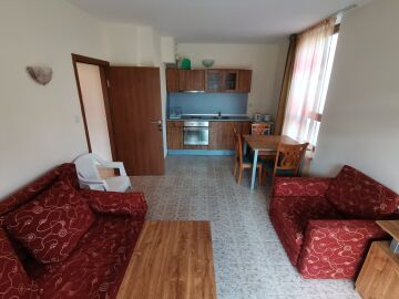 Апартамента се намира на първи етаж и се състои от хол с кухня, спалня, баня с душ кабина, две тераси с гледка към двора и басейна. Пред апартамента има тераса която може да бъде заградена и обособена в местенце за почивка. Апартамента е на площ от 54 м2 и е напълно обзаведен и оборудван.