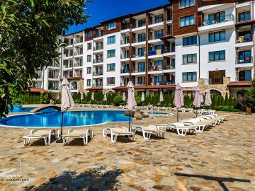 Апартамента е разположен на 3-ти етаж и е с площ 47 кв.м. Състои се от дневна с кухненски бокс, една спалня, баня и тераса с гледка към басейна. Продава се напълно обзаведен и готов за нанасяне.