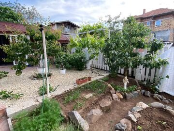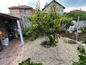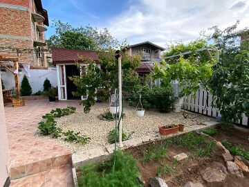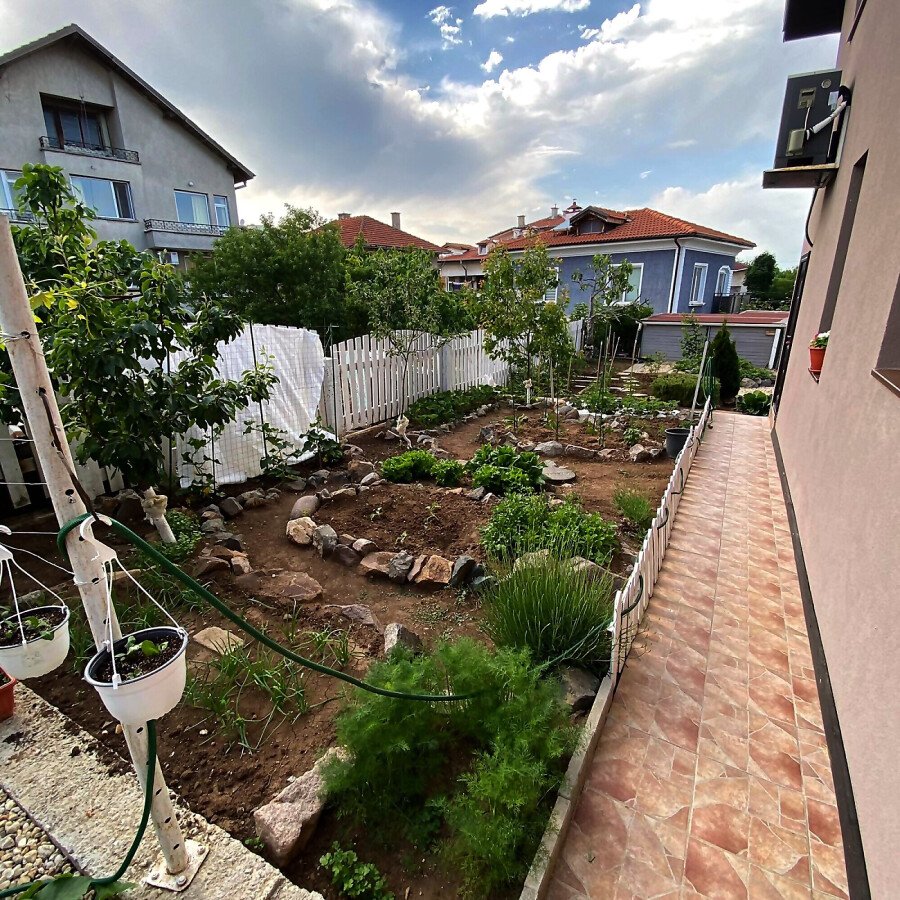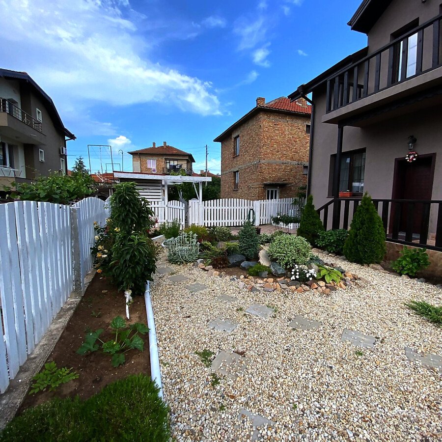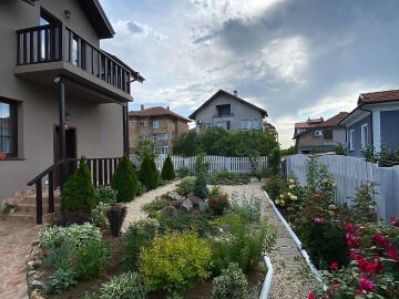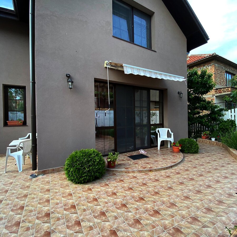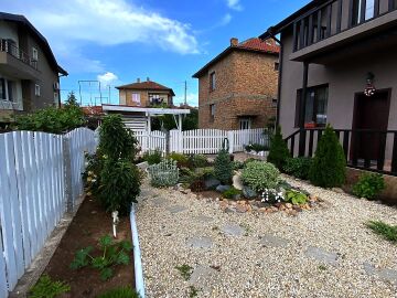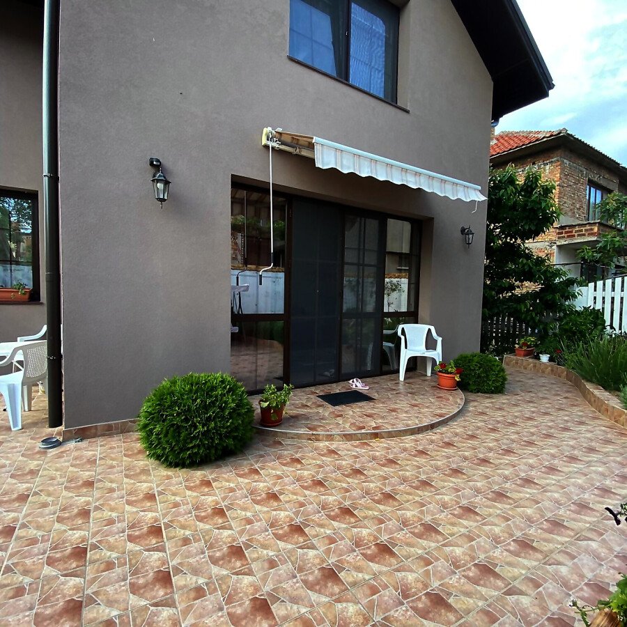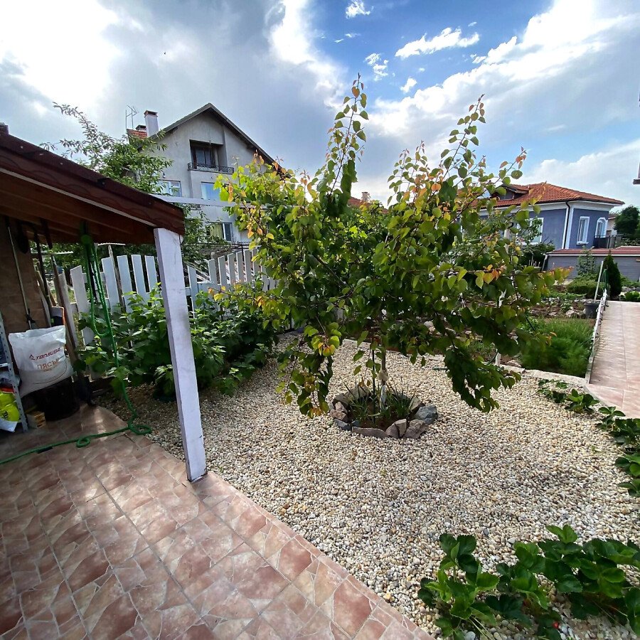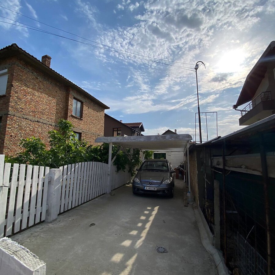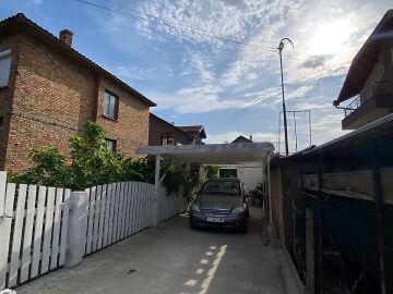 В двора на къщата има закрит паркинг с възможност да се поберат до 3 коли, беседка с барбекю, декоративни дървета и овошки. Лятна кухня с място за отдих, дървена маса с висящи люлки. Къщата е 170 кв.м. на два етажа.