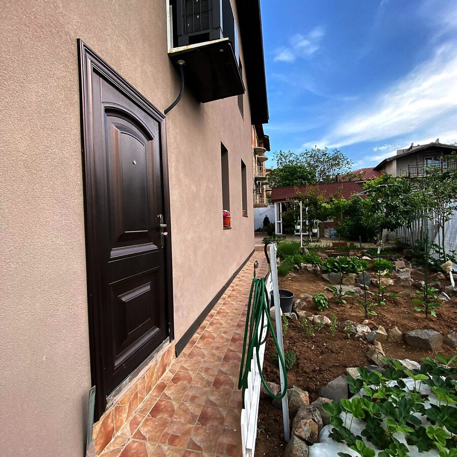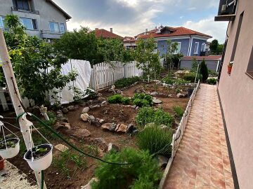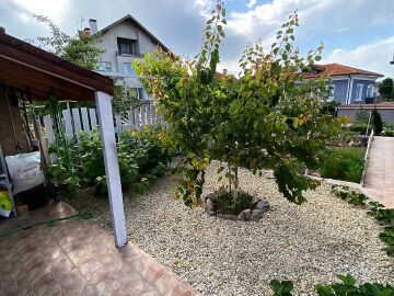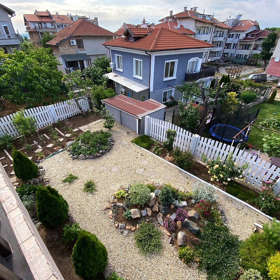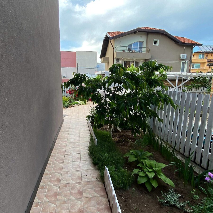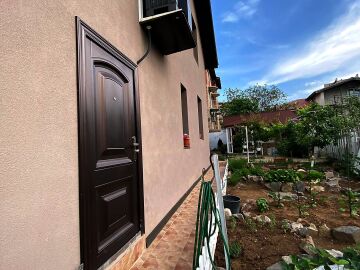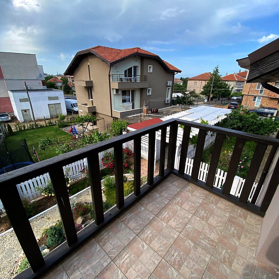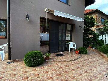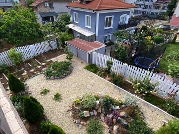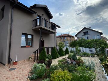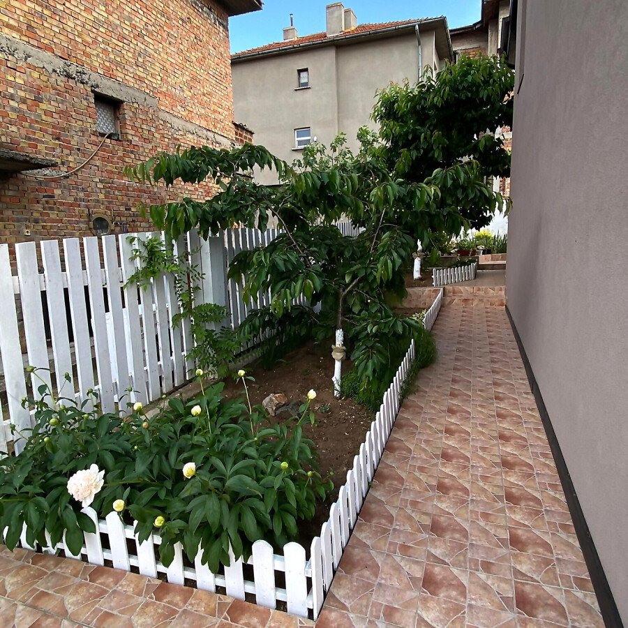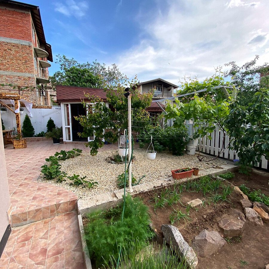В двора на къщата има закрит паркинг с възможност да се поберат до 3 коли, беседка с барбекю, декоративни дървета и овошки. Лятна кухня с място за отдих, дървена маса с висящи люлки. Къщата е 170 кв.м. на два етажа.