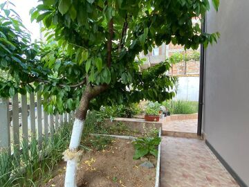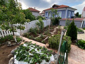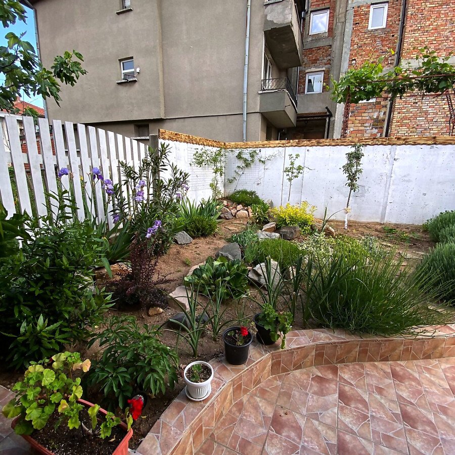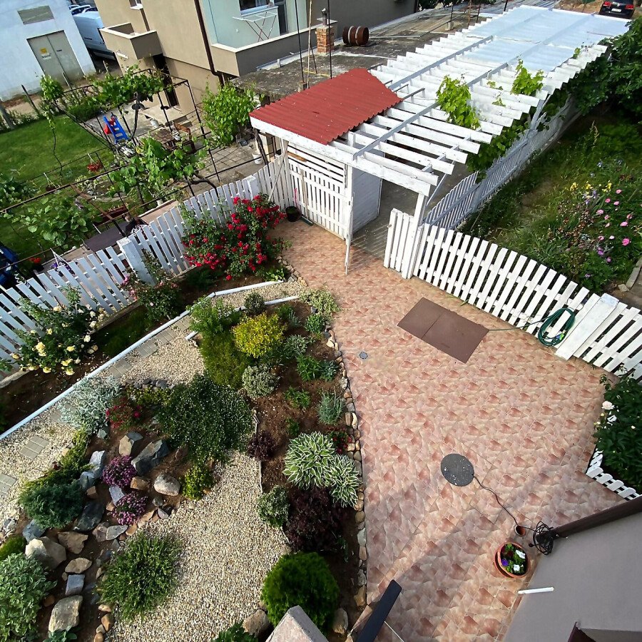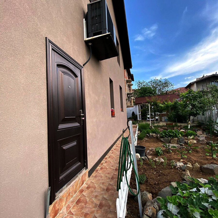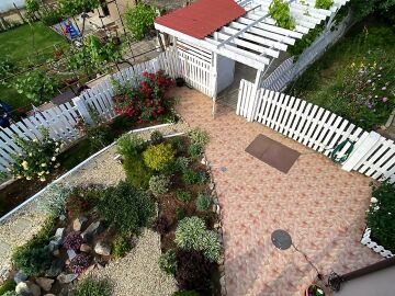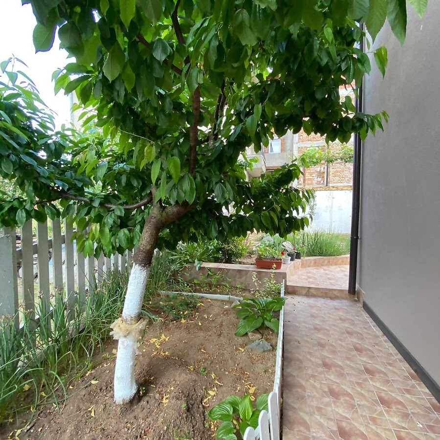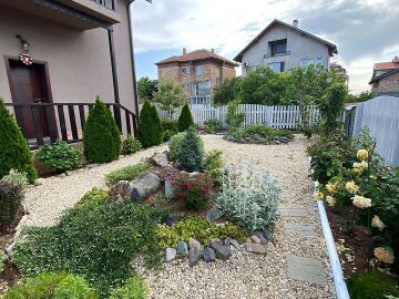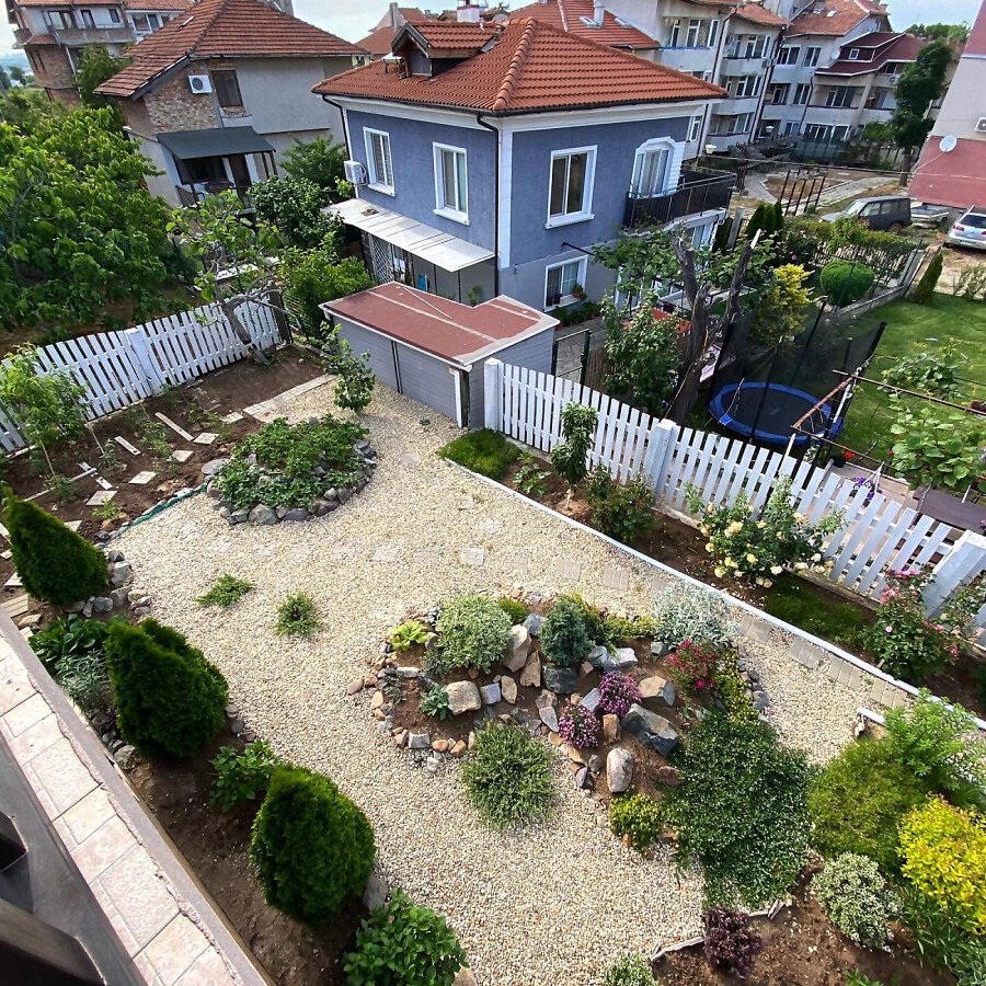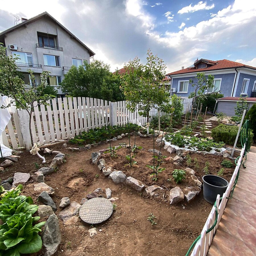 В двора на къщата има закрит паркинг с възможност да се поберат до 3 коли, беседка с барбекю, декоративни дървета и овошки. Лятна кухня с място за отдих, дървена маса с висящи люлки. Къщата е 170 кв.м. на два етажа.