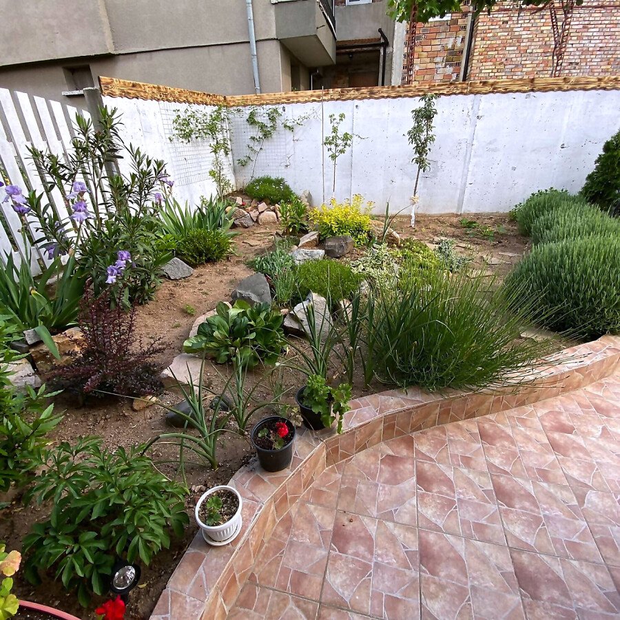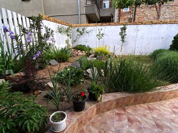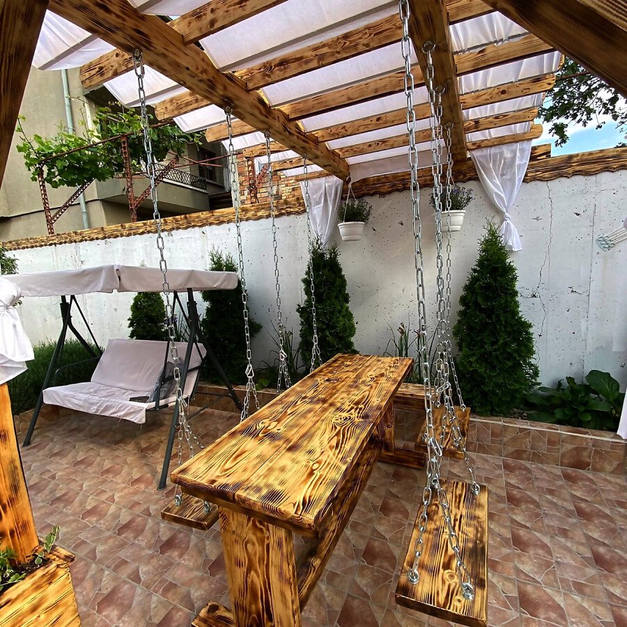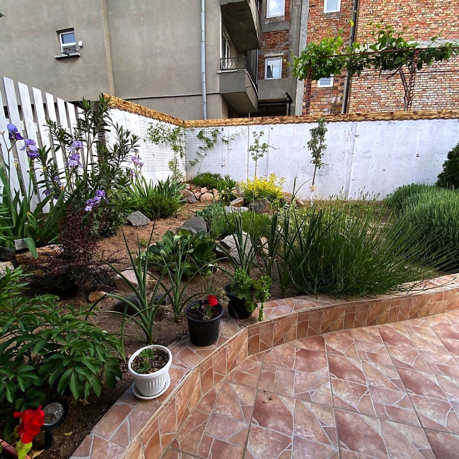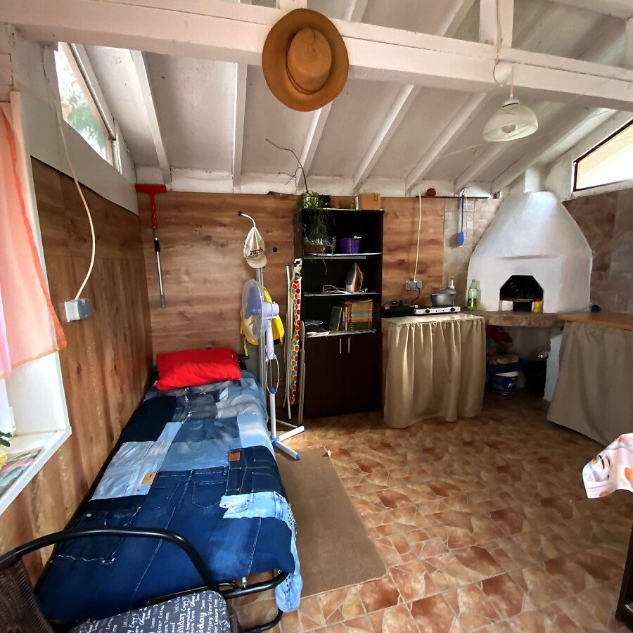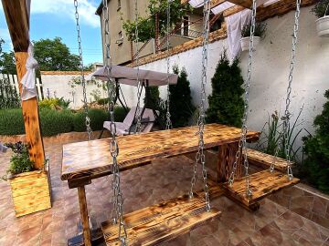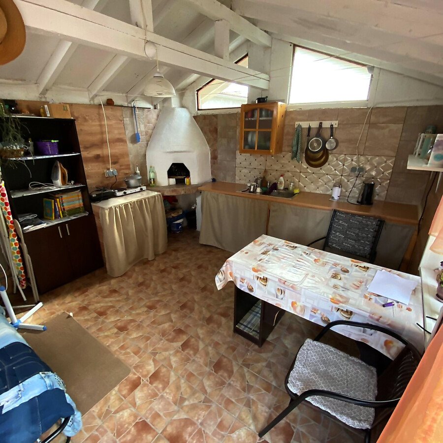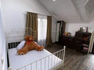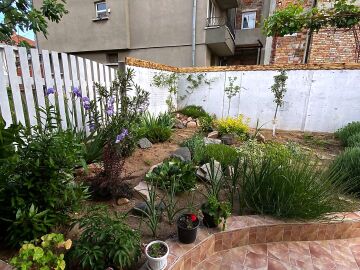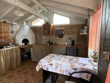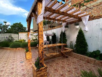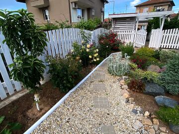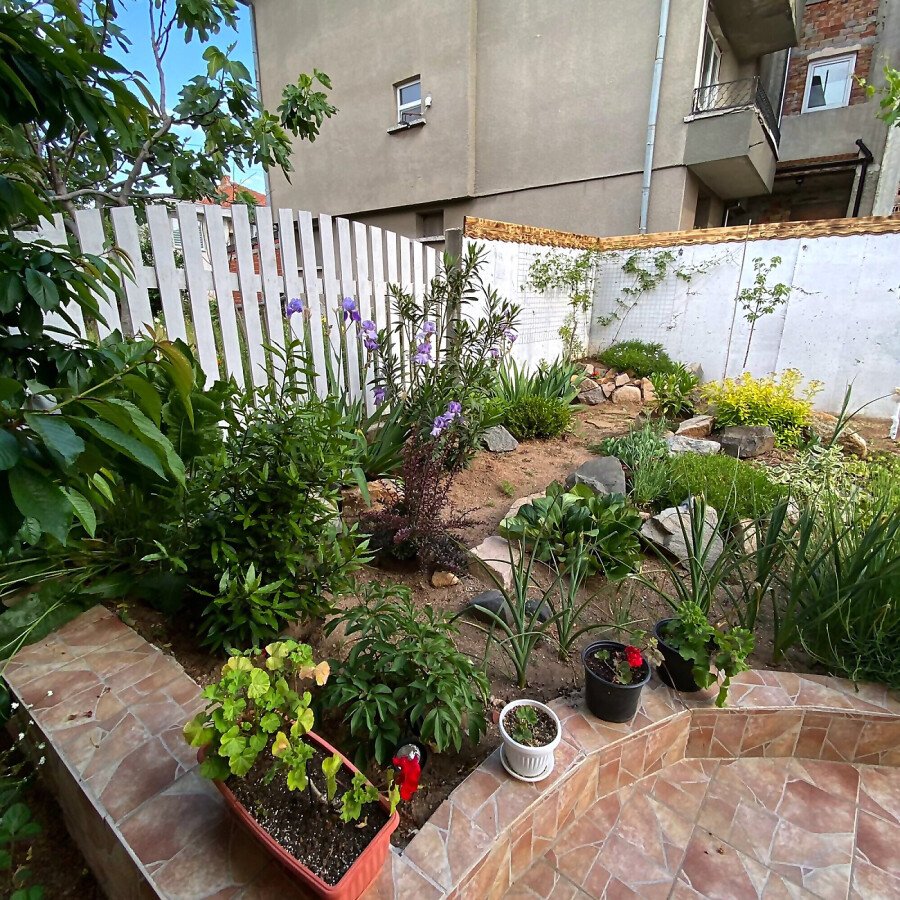 В двора на къщата има закрит паркинг с възможност да се поберат до 3 коли, беседка с барбекю, декоративни дървета и овошки. Лятна кухня с място за отдих, дървена маса с висящи люлки. Къщата е 170 кв.м. на два етажа.
