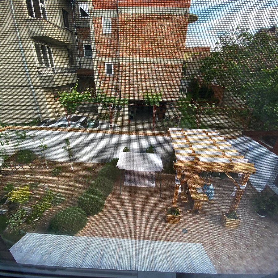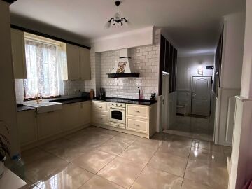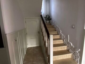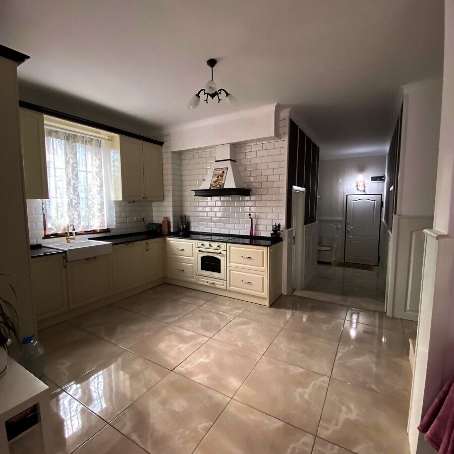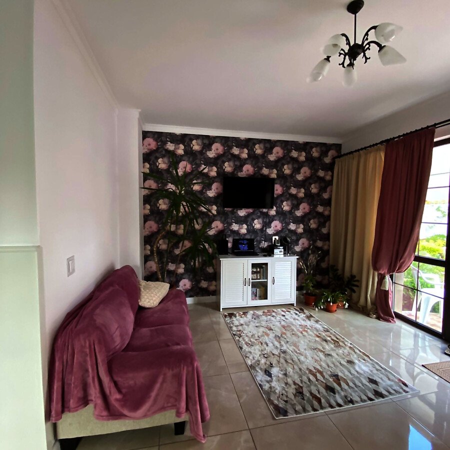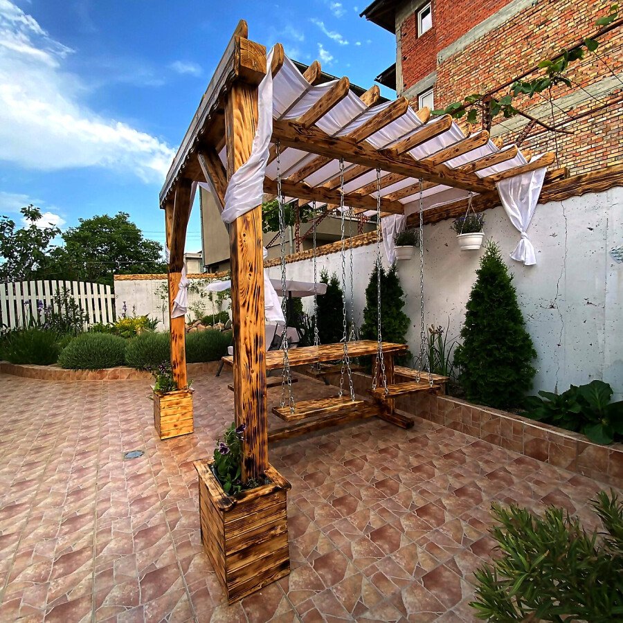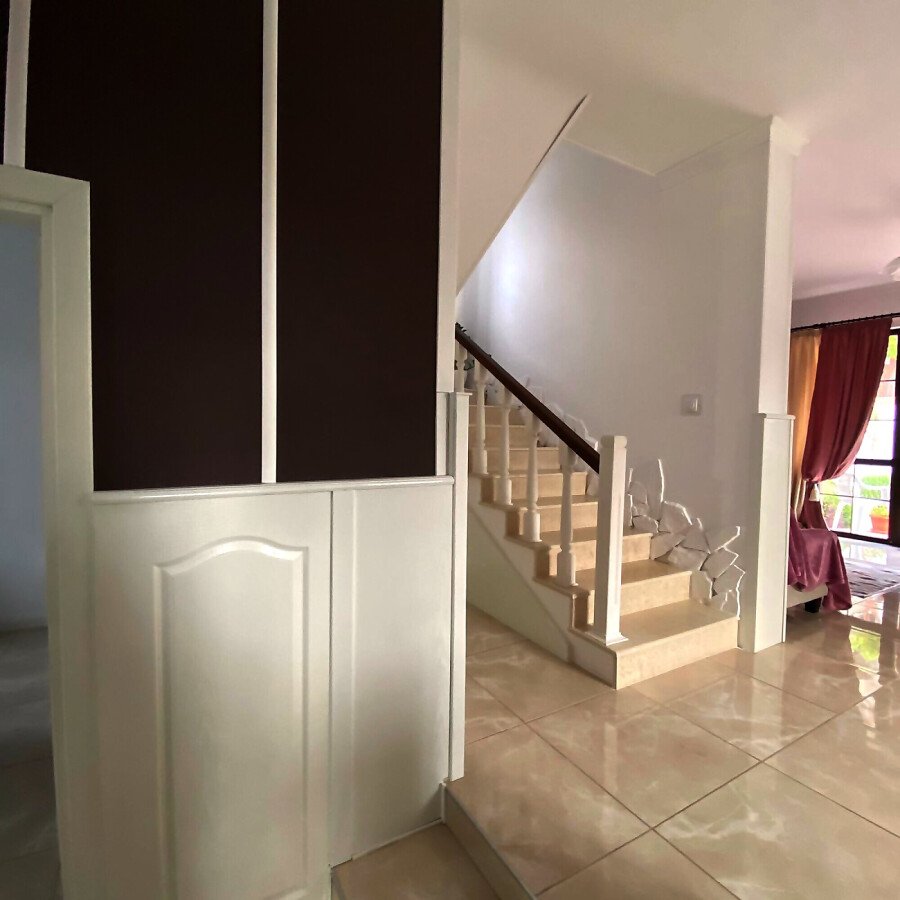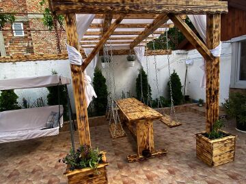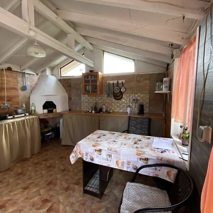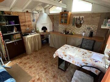 В двора на къщата има закрит паркинг с възможност да се поберат до 3 коли, беседка с барбекю, декоративни дървета и овошки. Лятна кухня с място за отдих, дървена маса с висящи люлки. Къщата е 170 кв.м. на два етажа.