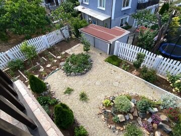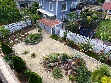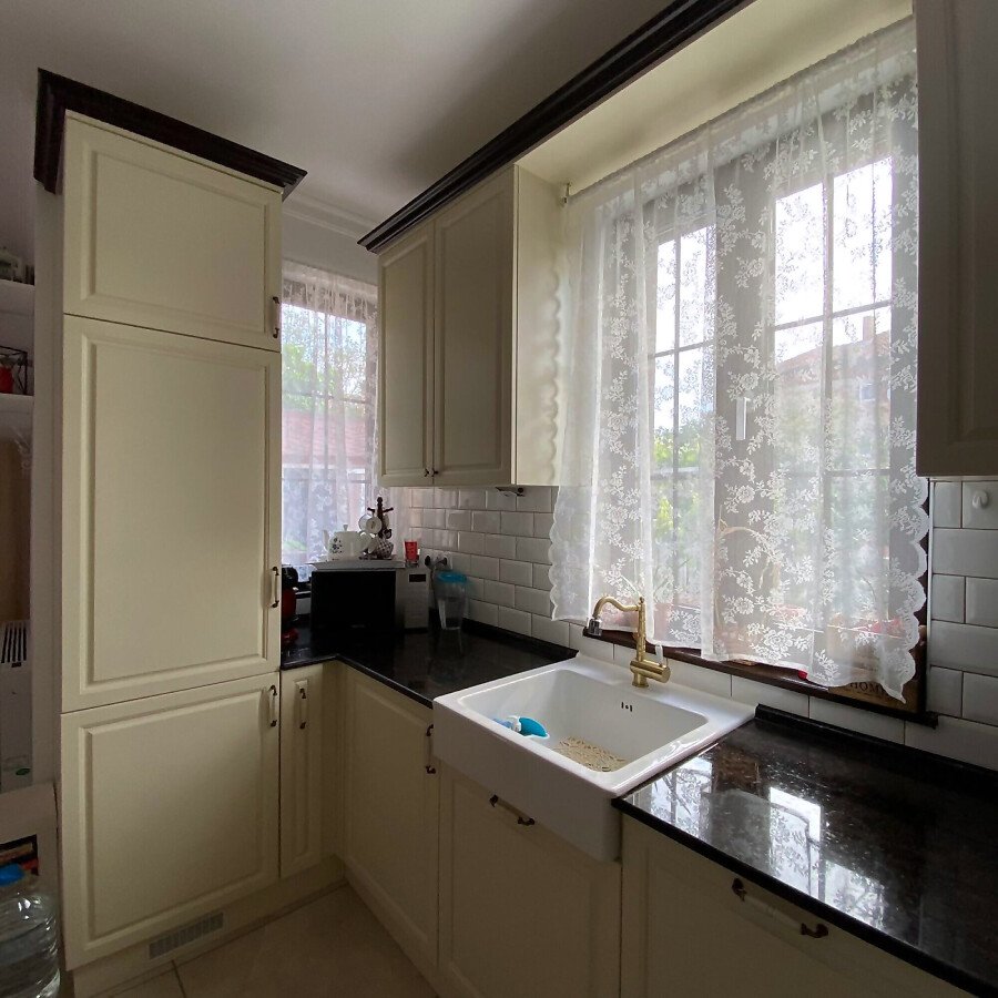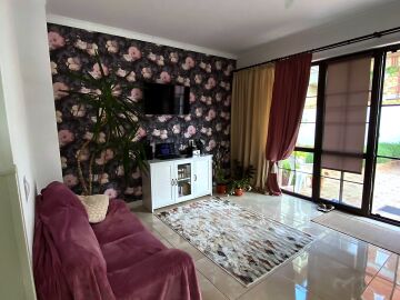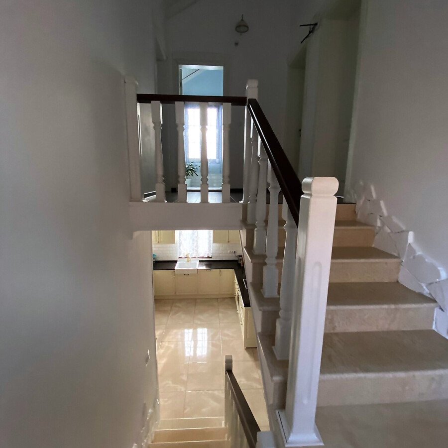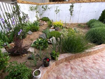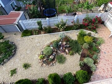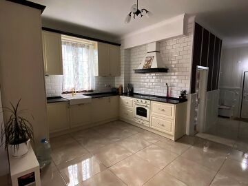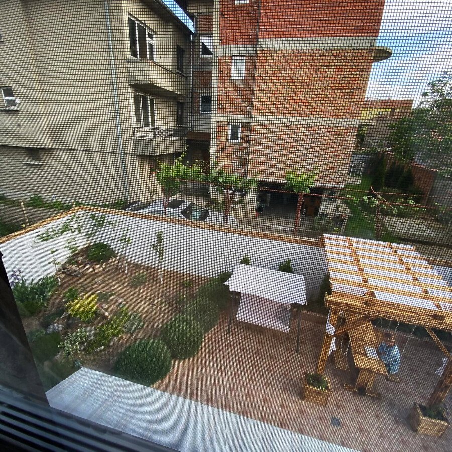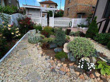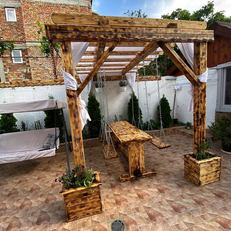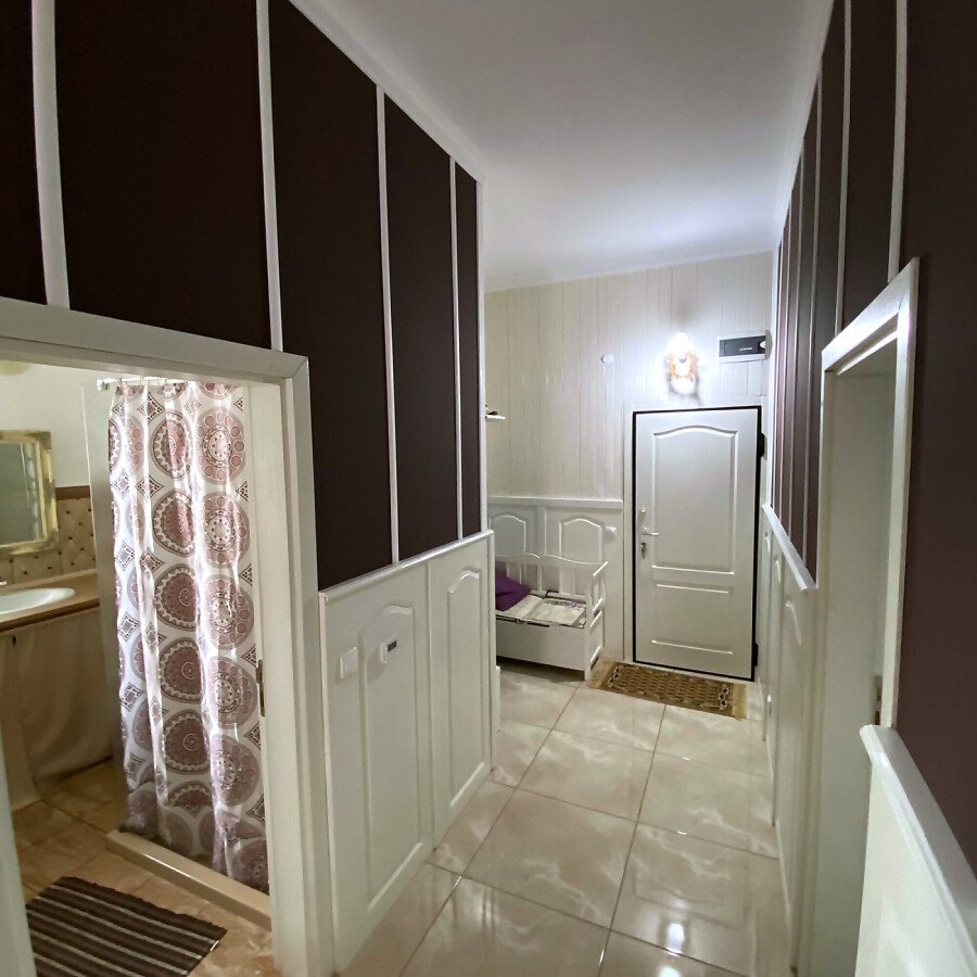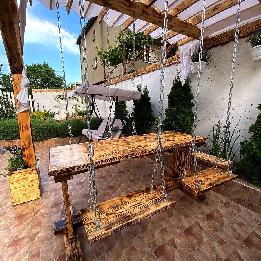 В двора на къщата има закрит паркинг с възможност да се поберат до 3 коли, беседка с барбекю, декоративни дървета и овошки. Лятна кухня с място за отдих, дървена маса с висящи люлки. Къщата е 170 кв.м. на два етажа.