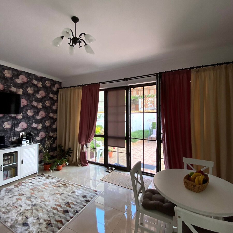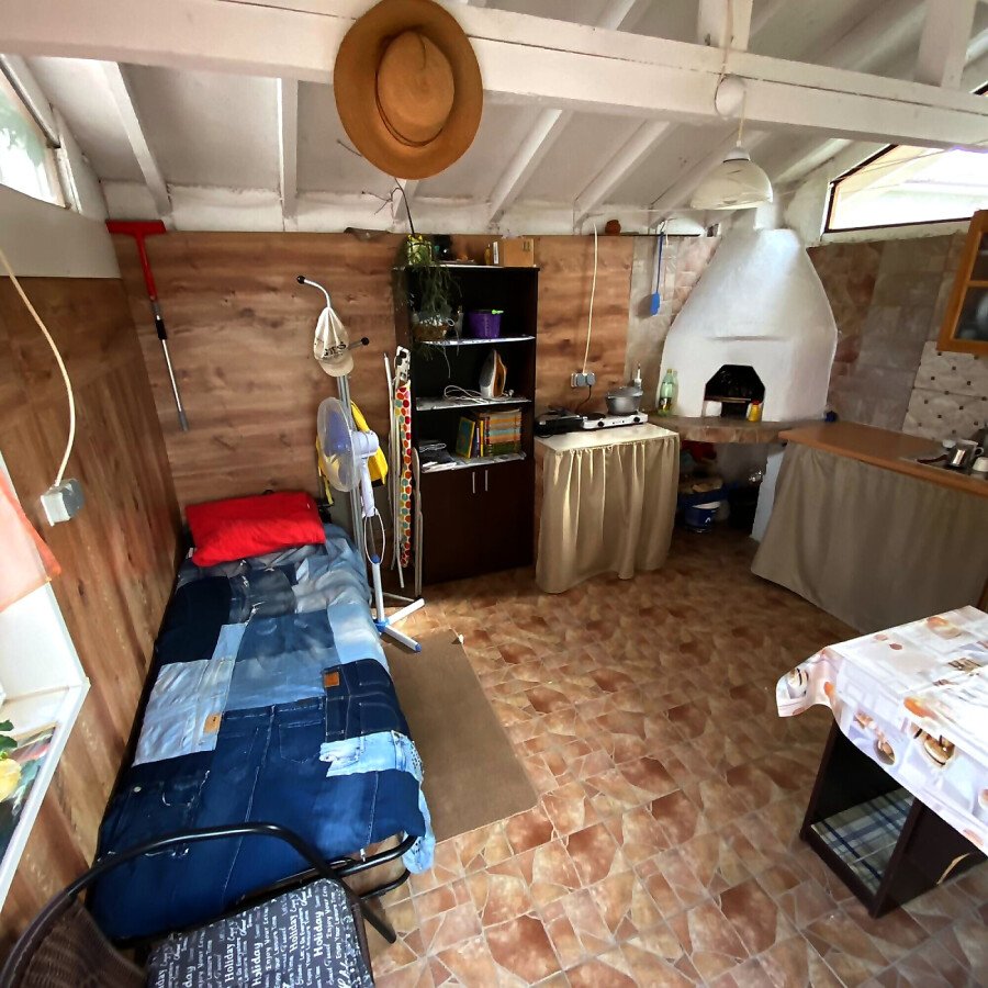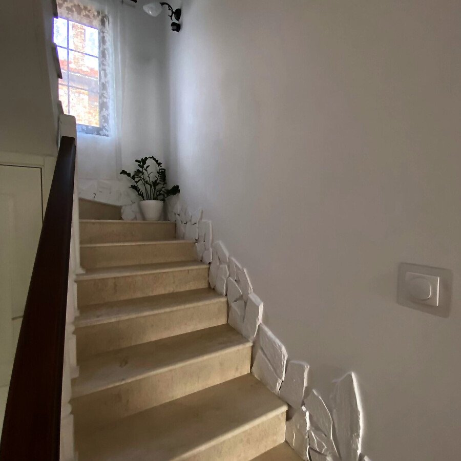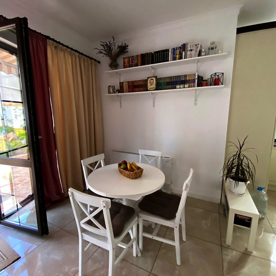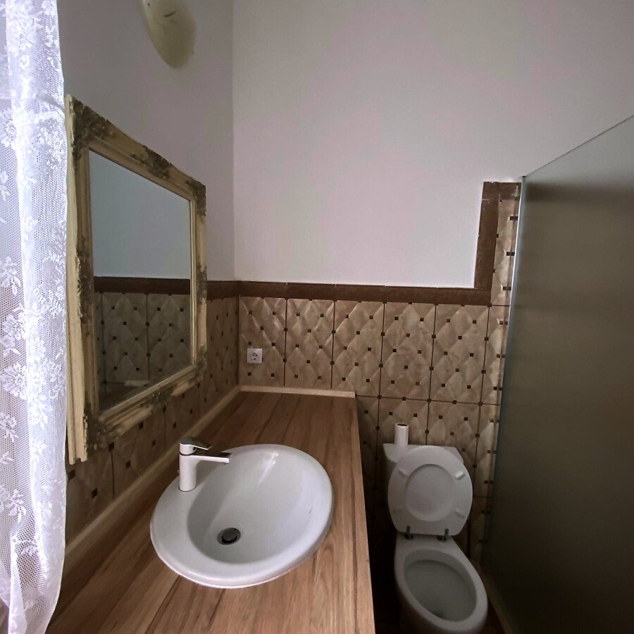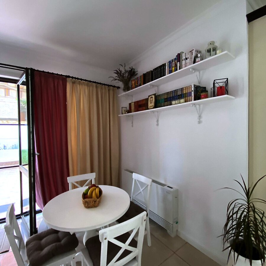 На първия етаж има коридор, офис - спалня, голяма уютна всекидневна с кухненска част и изход към двора, баня с душ кабина, складово помещение и стълби към втори етаж.