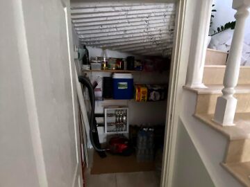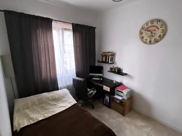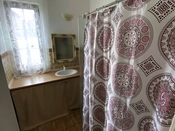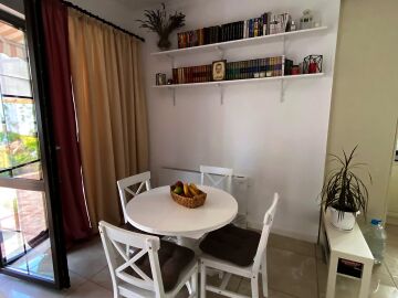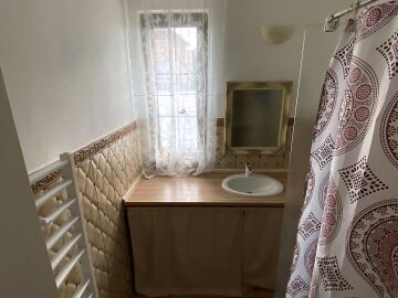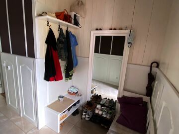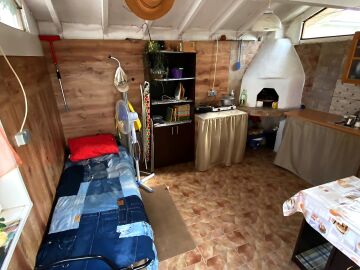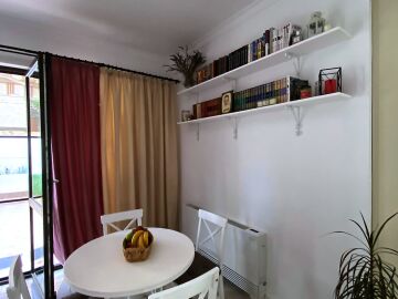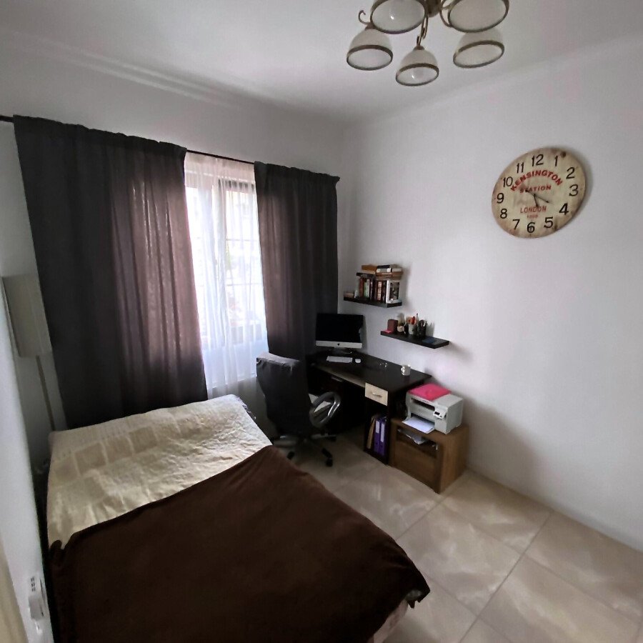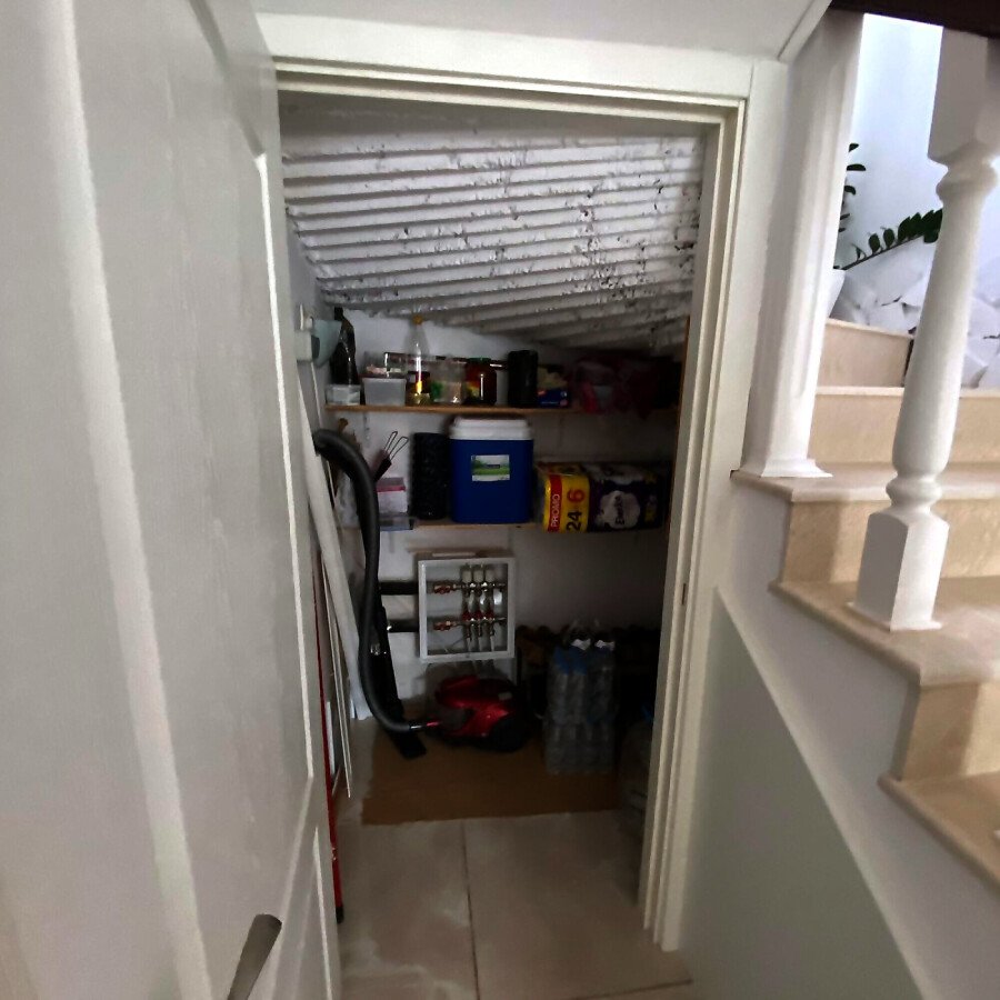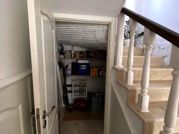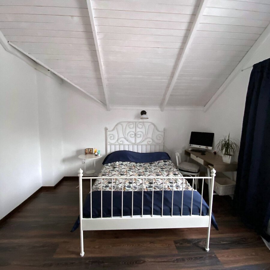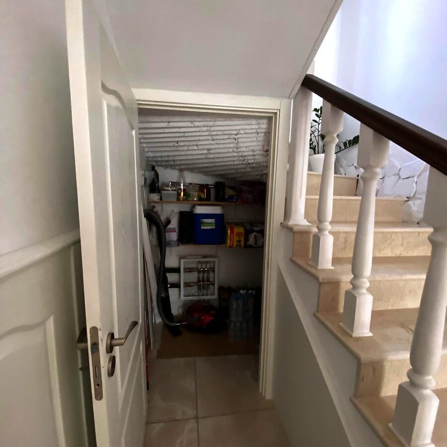 На първия етаж има коридор, офис - спалня, голяма уютна всекидневна с кухненска част и изход към двора, баня с душ кабина, складово помещение и стълби към втори етаж.