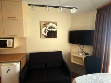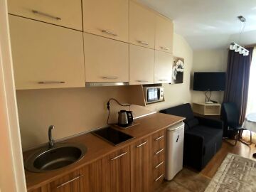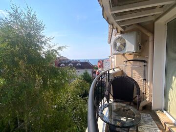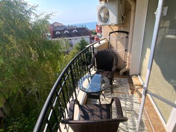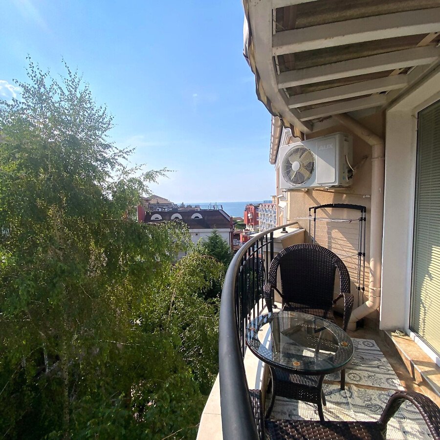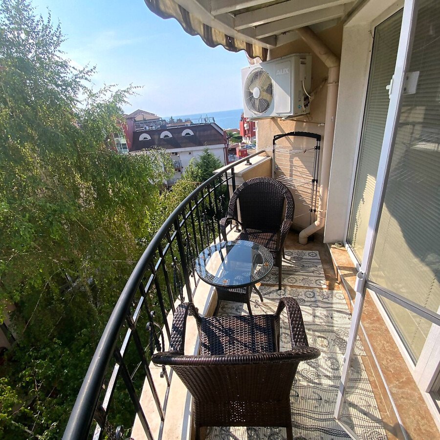 Намира се на пети етаж и е с площ от 54 кв.м. състои се от дневна с кухненски бокс, спалня, баня и тераса с гледка към морето и градината на комплекса. На терасата е разположена зано за отдих, където можете да си почивате и да се наслаждавате на следобедите си.