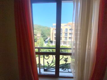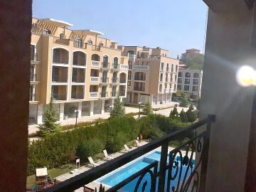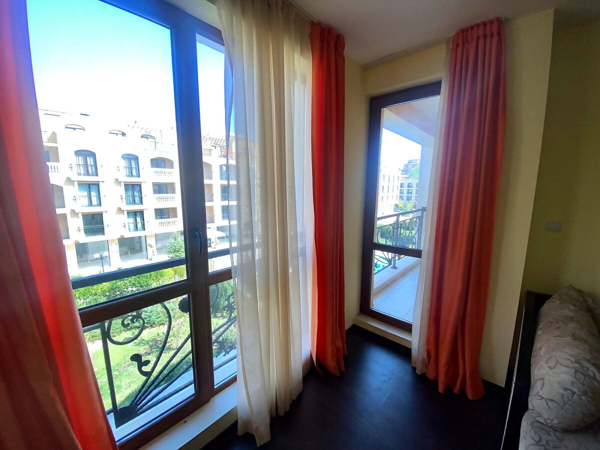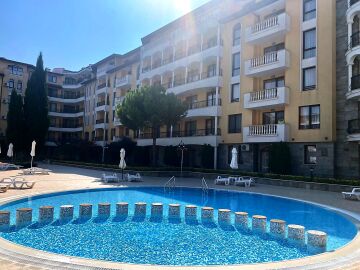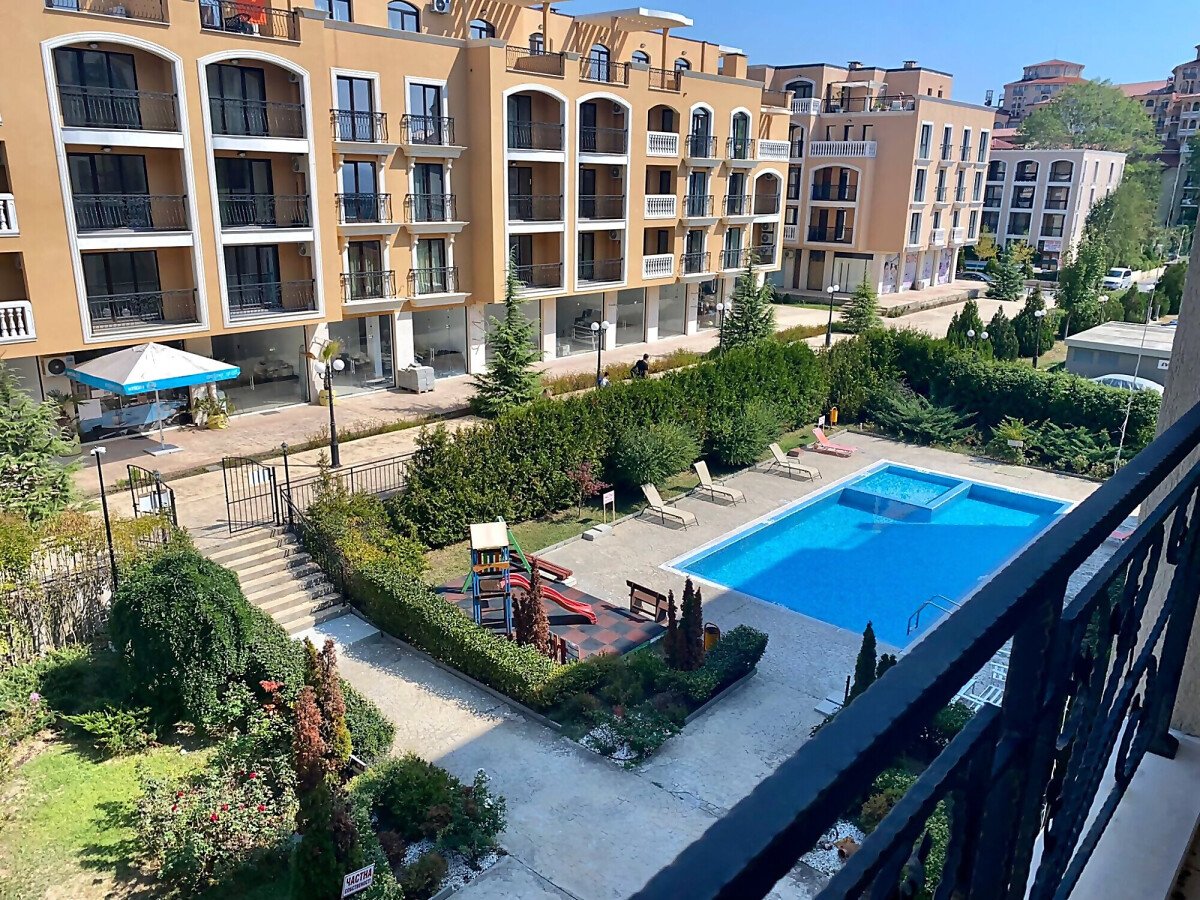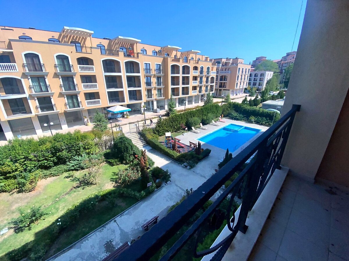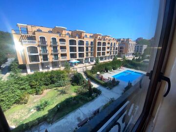 Площта му е 60 кв.м. разположен на четвърти етаж с гледка към градината и басейна.