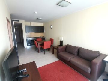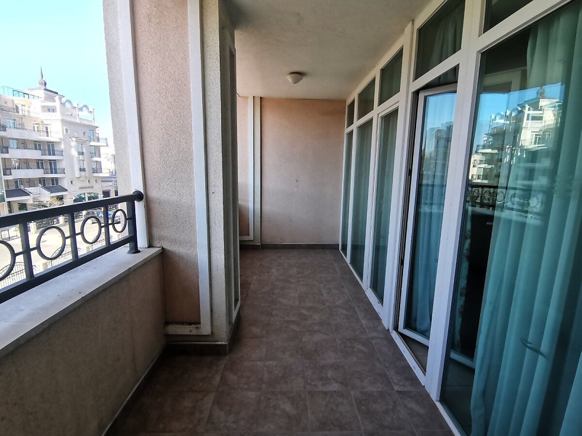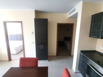 Апартаментът е с чудесно функционално разпределение – голямо антре с дрешник, просторен хол с оборудван кухненски бокс, две спални, баня с вана и тоалетна и удобен обособен балкон с частична гледка към морето.