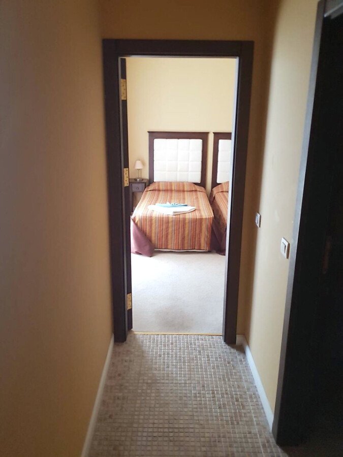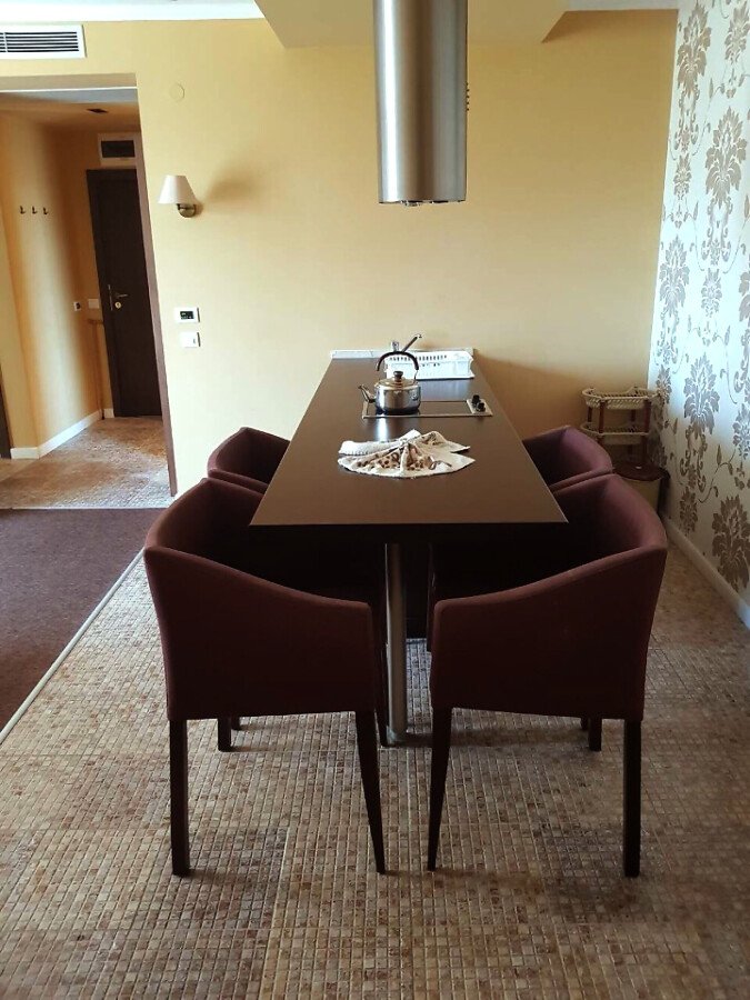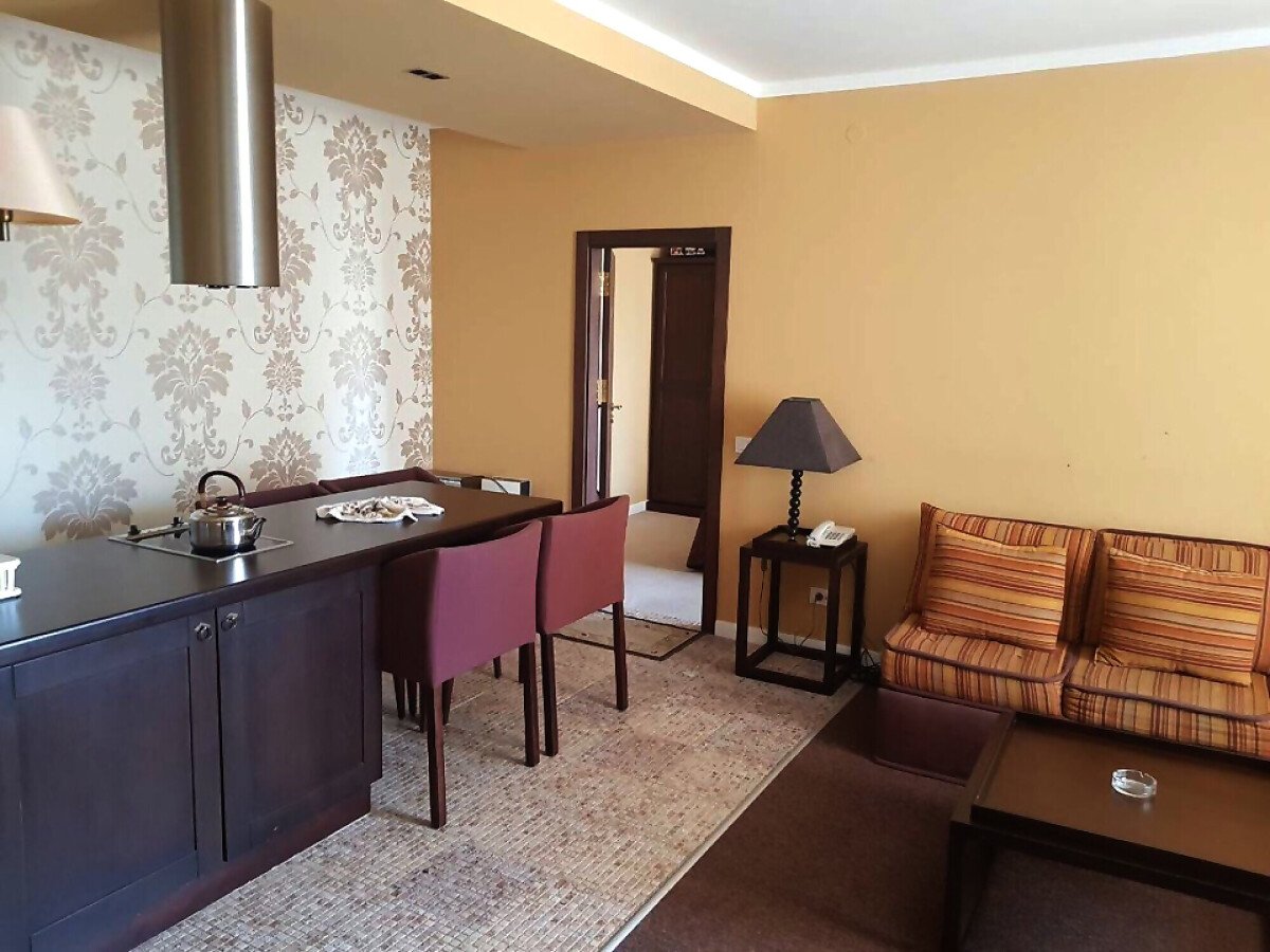 Апартаментът е с площ от 98 кв.м и е на трети етаж в комплекса. Състои се от хол с кухненска част (кухнята е тип остров и е оборудвана с котлон и аспиратор, трапезна част със столове), две спални, баня, отделна тоалетна и две тераси с изглед към басейна.