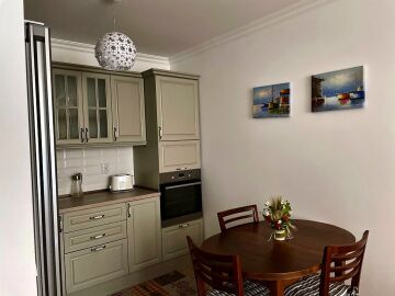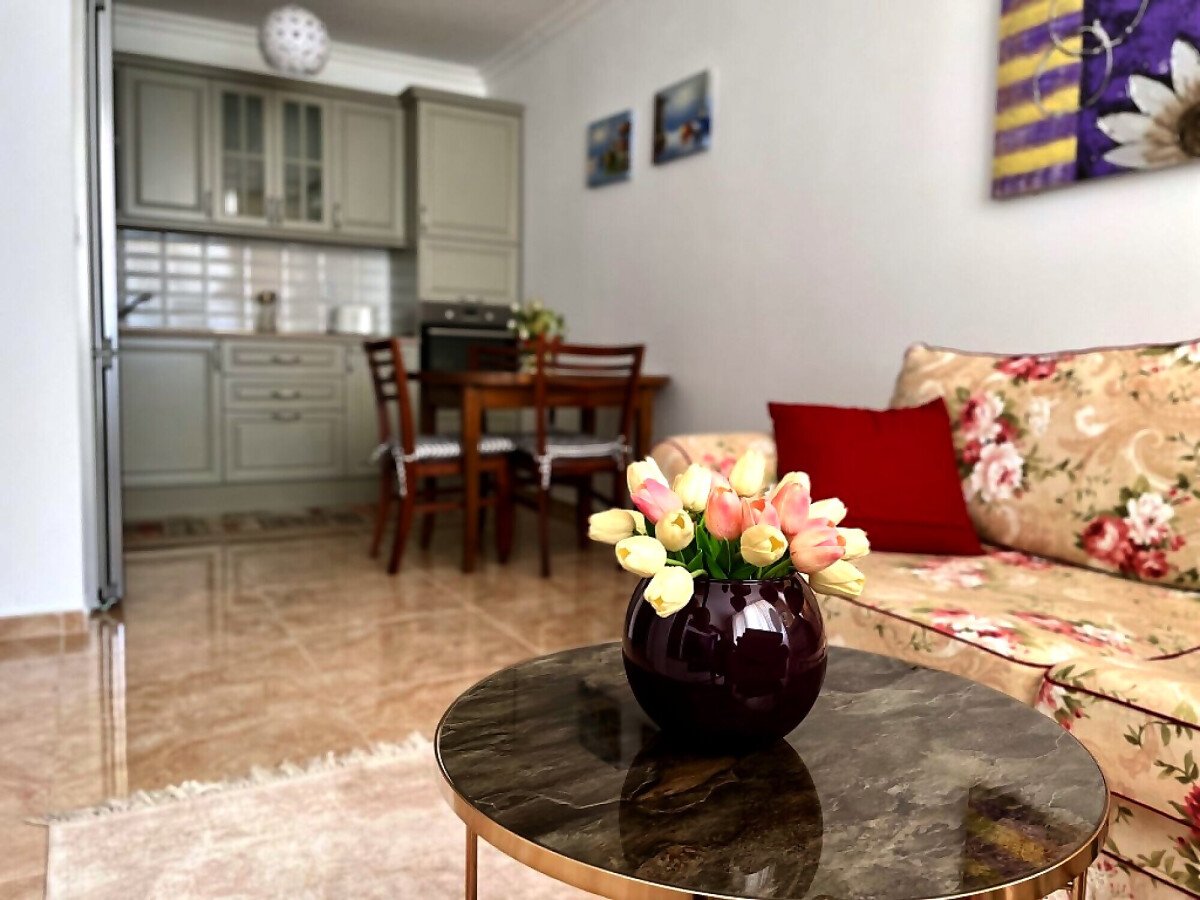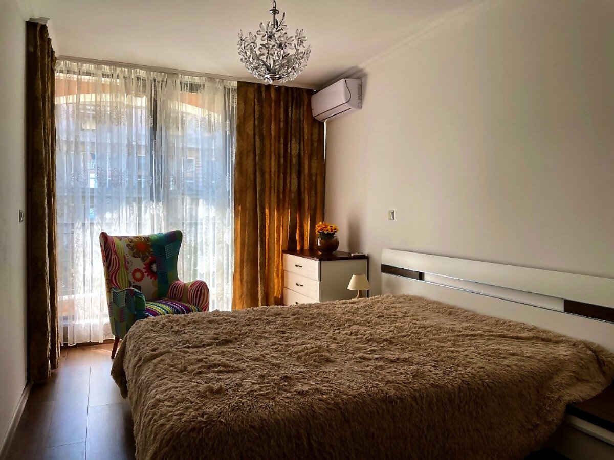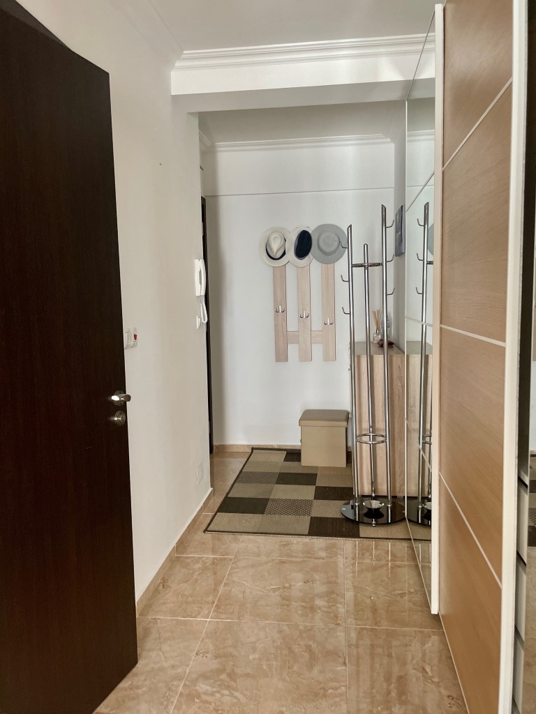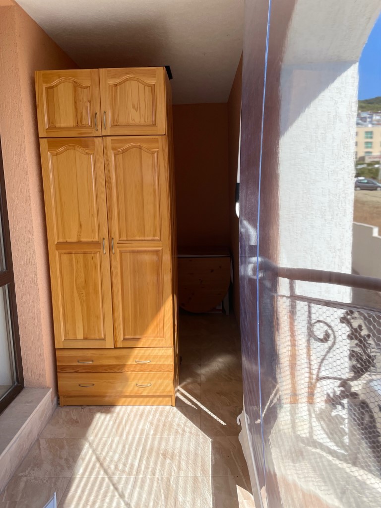 Апартаментът е изключително стилен, с обзавеждане по поръчка. Състои се от входно антре, всекидневна с напълно оборудван кухненски бокс, спалня, баня с тоалетна и просторна тераса с красива, частична гледка към морето. Такса поддръжка на имота е 600 EUR годишно.