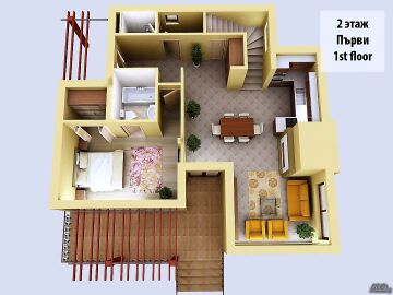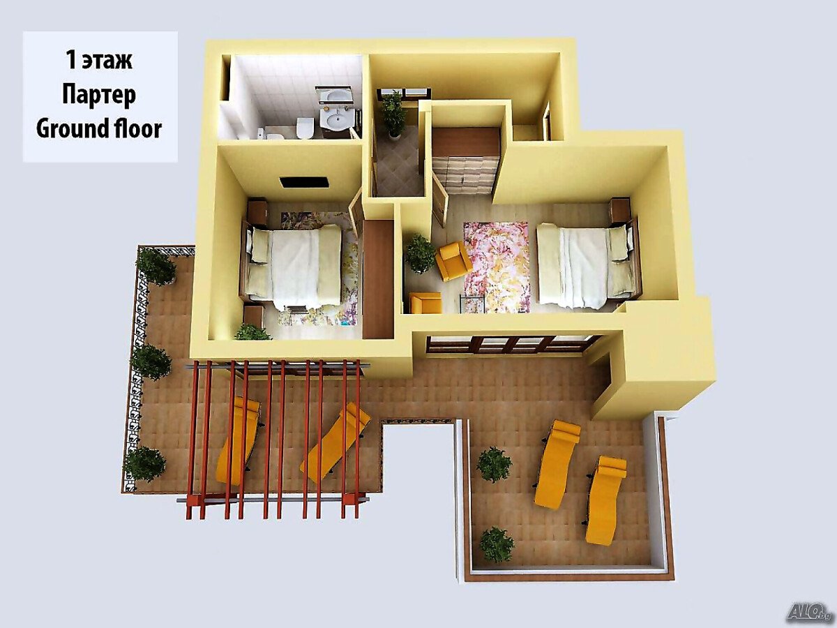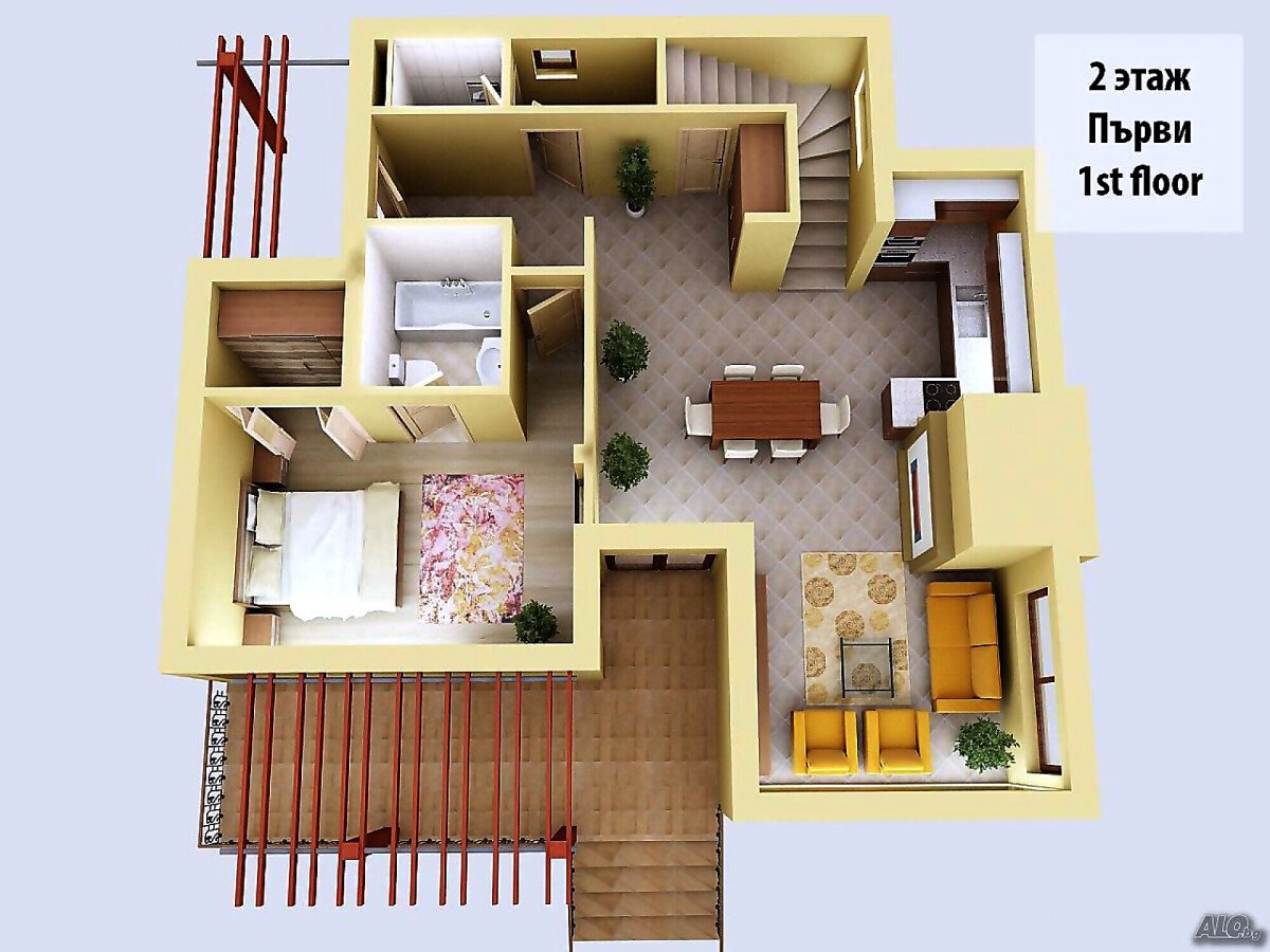 На първия етаж има просторна дневна с оборудвана кухня, една спалня и баня. Тук е разположена и страхотна голяма тераса, подходяща за слънчеви бани или за обособяване на кът за почивка и време, прекарано със семейството и приятелите. На втория етаж има още две спални, две бани и големи тераси с барбекю.
