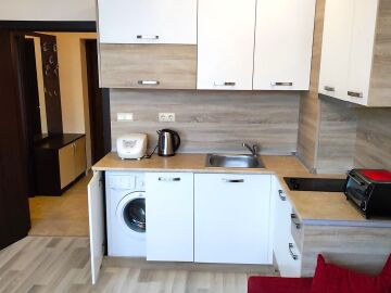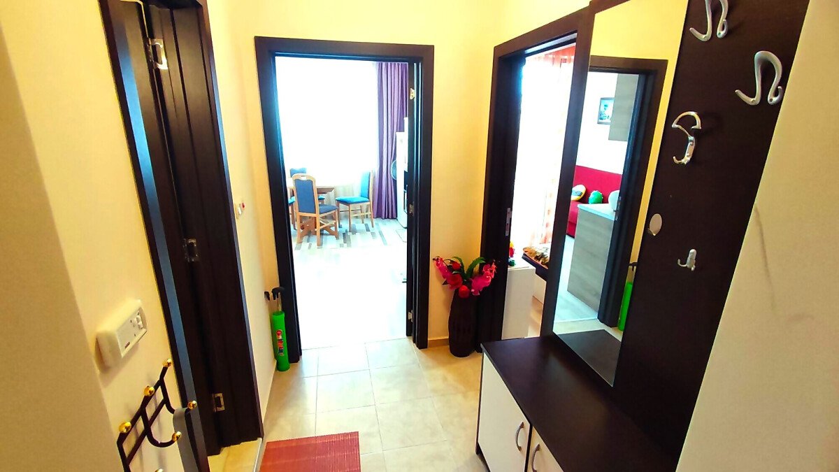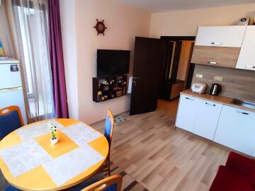 Апартаментът се състои се входно антре, всекидневна с кухненски бокс, спалня, баня с тоалетна и тераса с гледка към басейна и частична гледка към морето. Продава се напълно обзаведен и оборудван с необходимите електроуреди, готов за нанасяне.