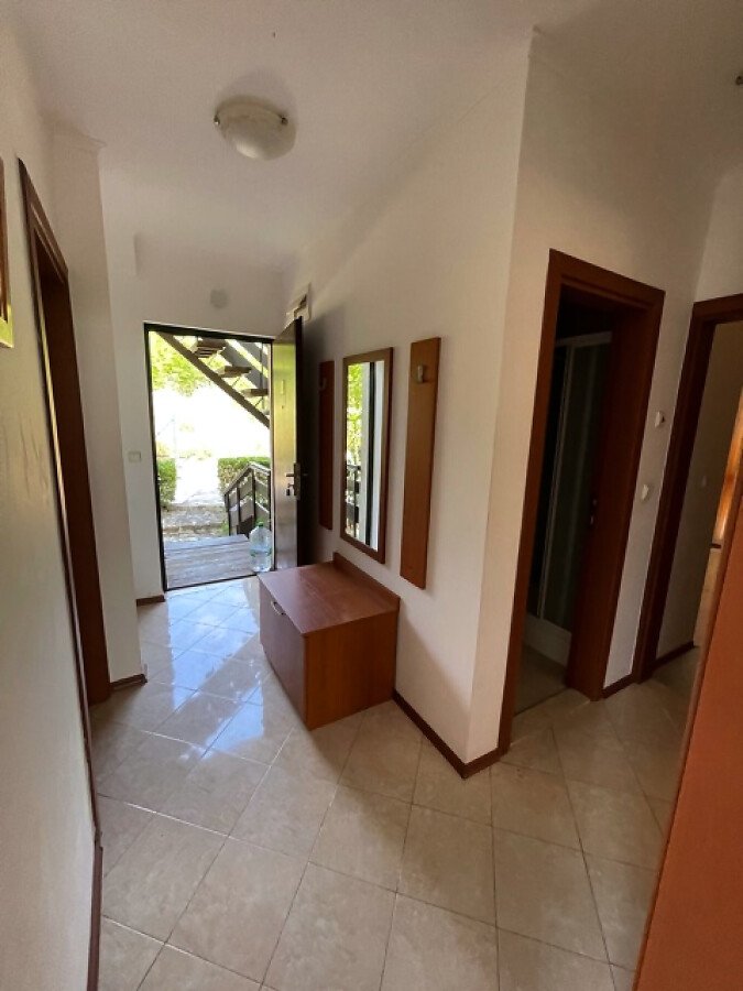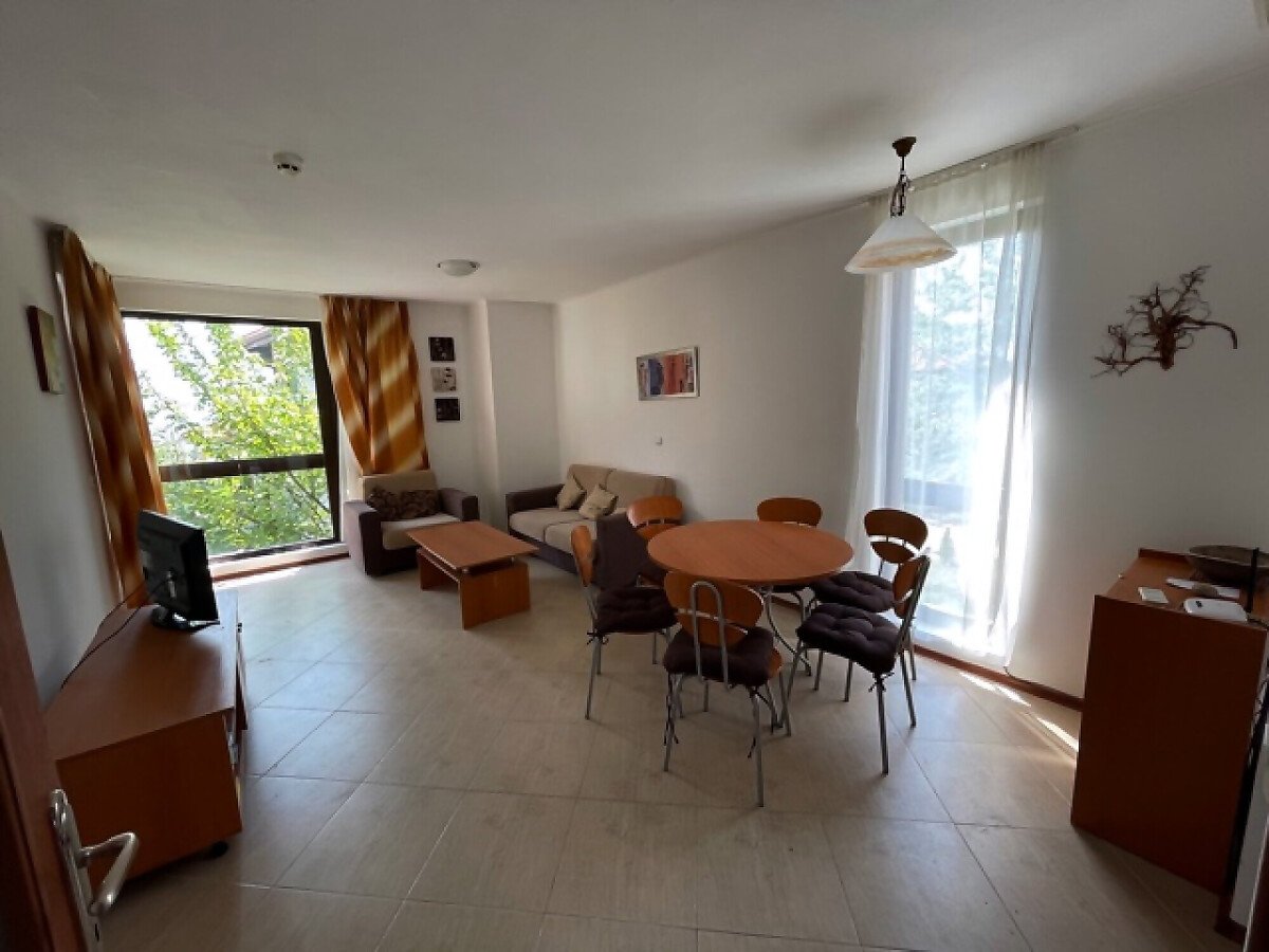 Апартаментът е разположен на втори етаж и се състои от входно антре, всекидневна с отделен кухненски бокс, две спални, две бани с тоалетни и две тераси. Продава се напълно обзаведен и оборудван с необходимите електроуреди за комфортен престой или постоянно живеене.