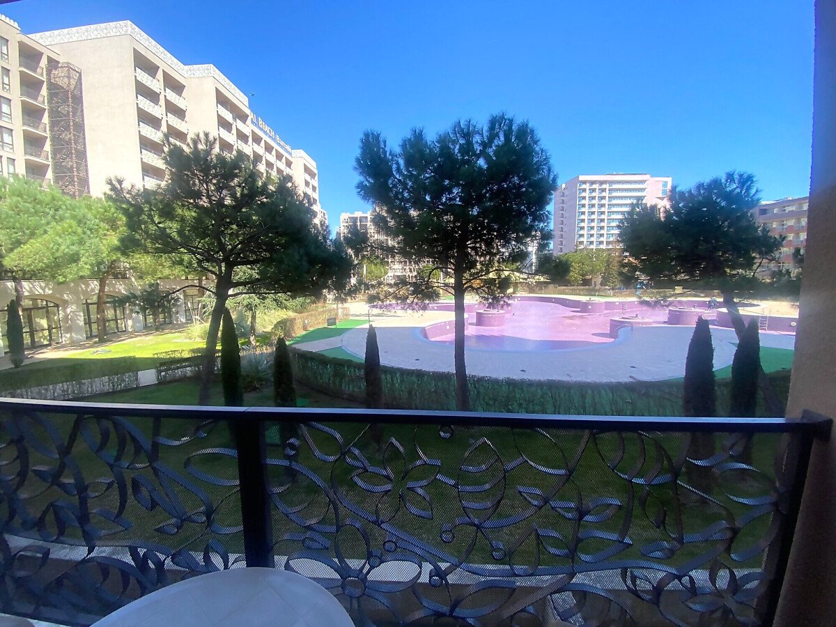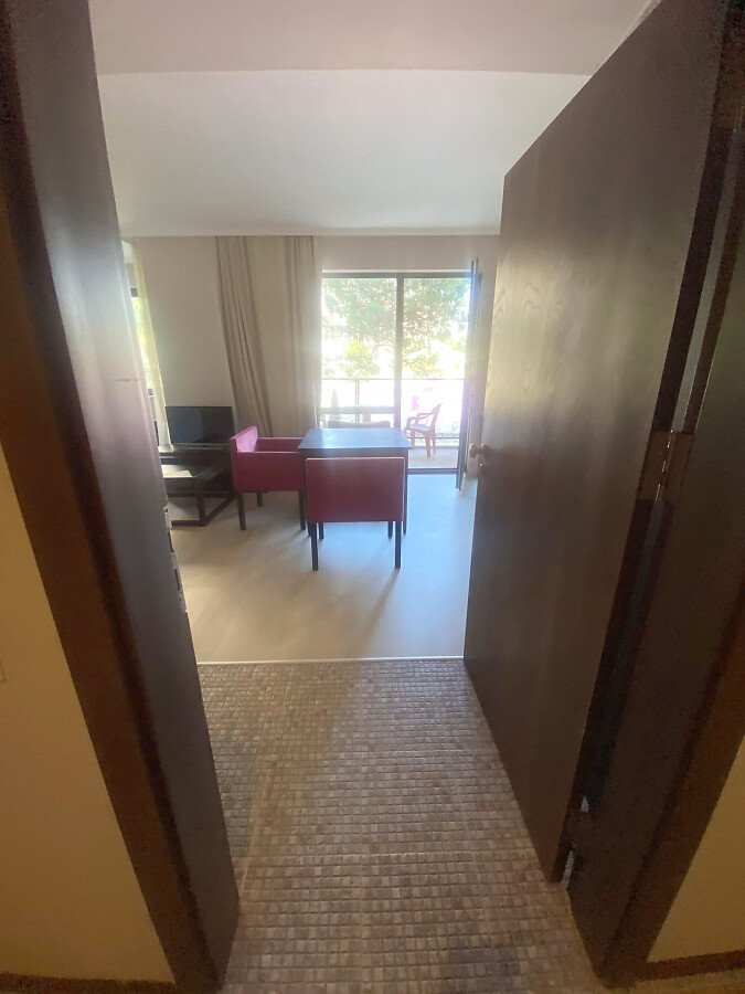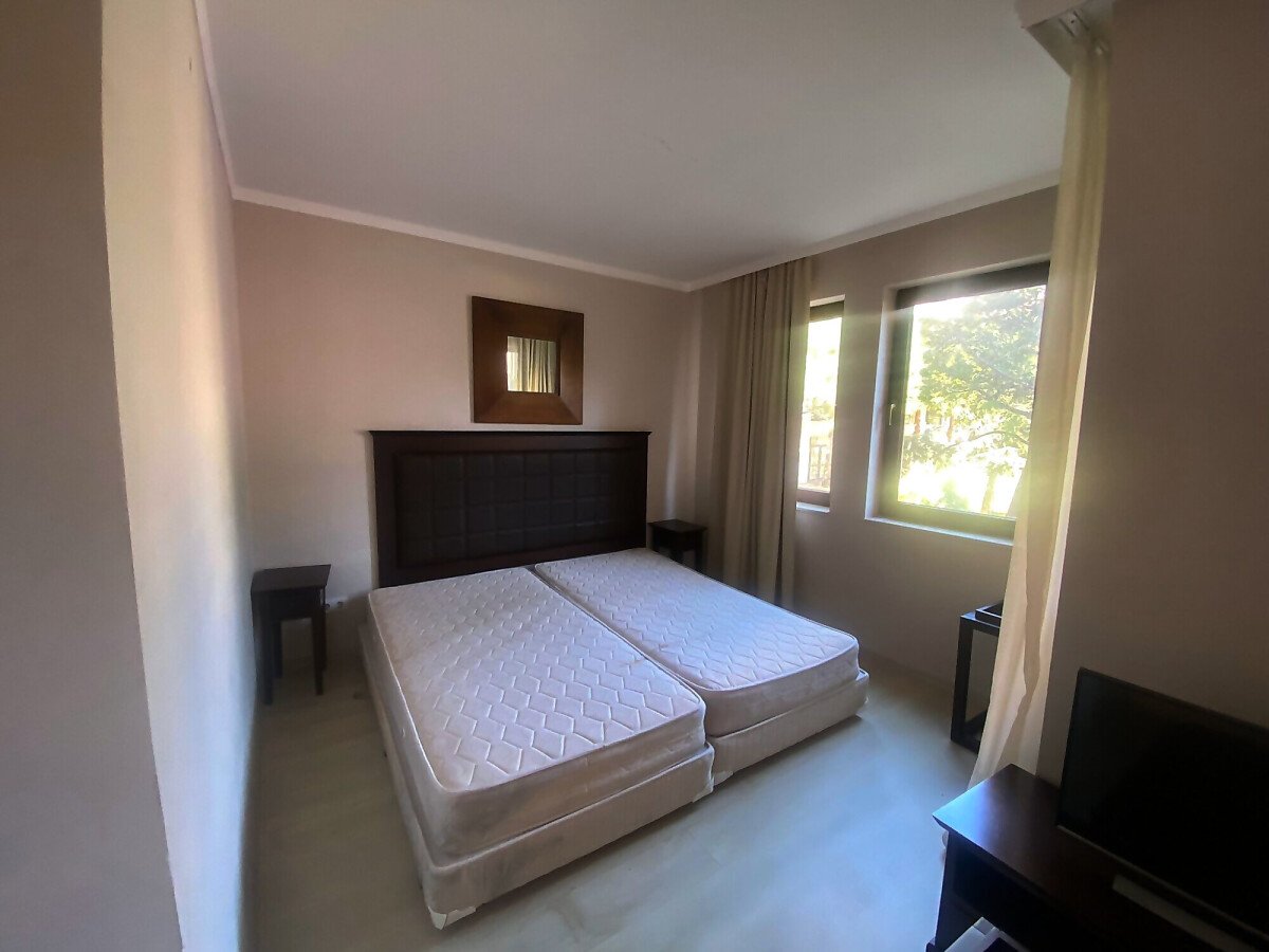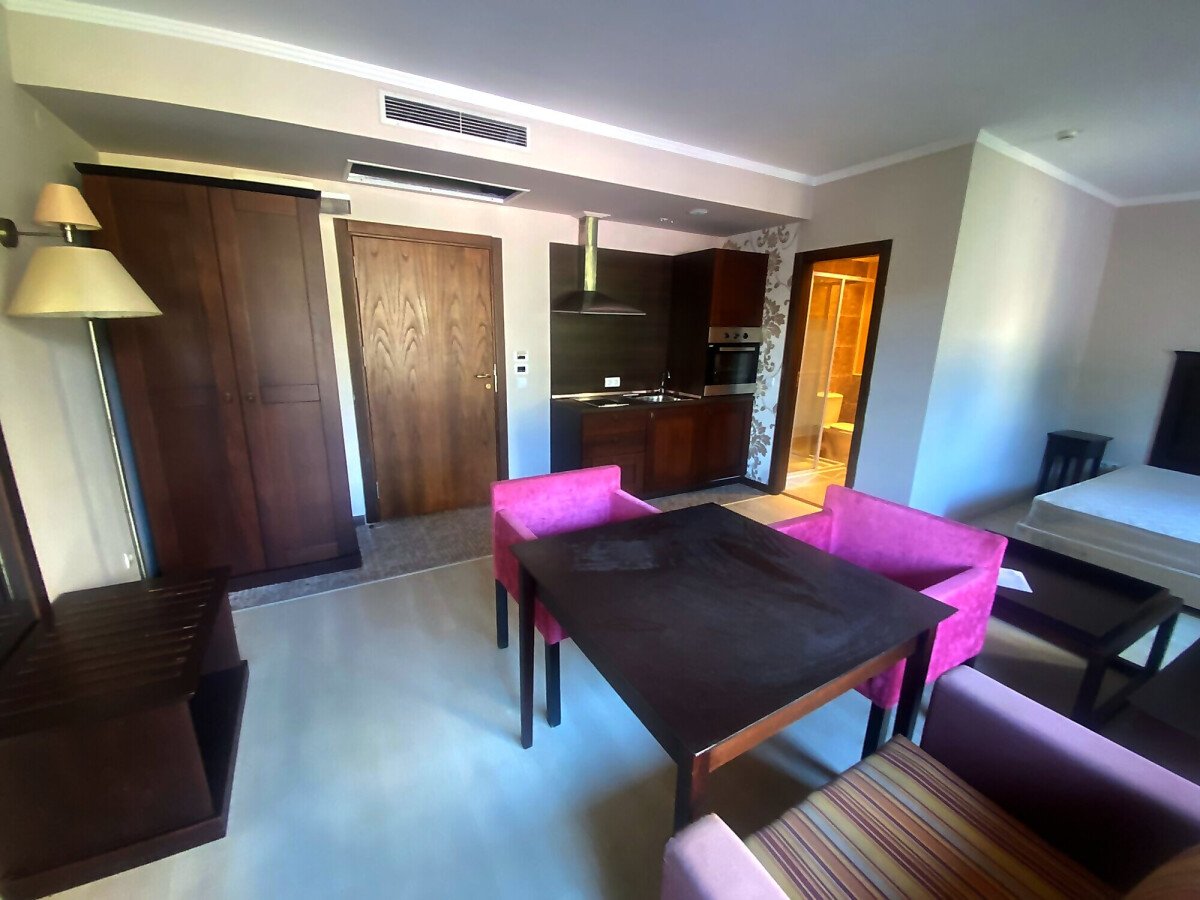 Студиото е просторно, обзаведено и оборудвано с необходимите електроуреди. Състои се от всекидневна с кухненски бокс, баня с тоалетна и тераса с гледка към басейна.