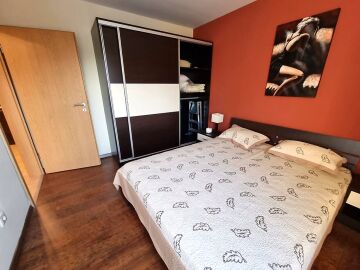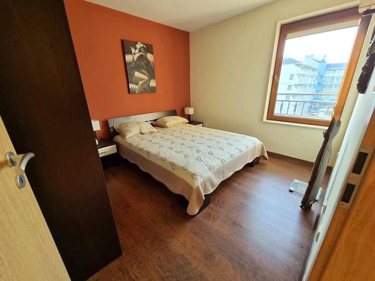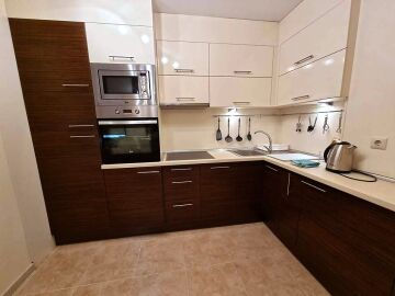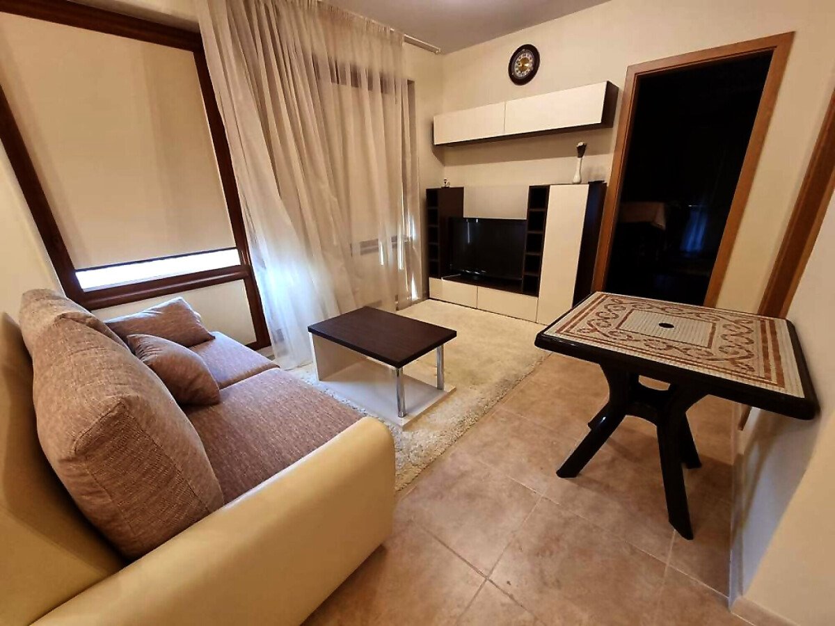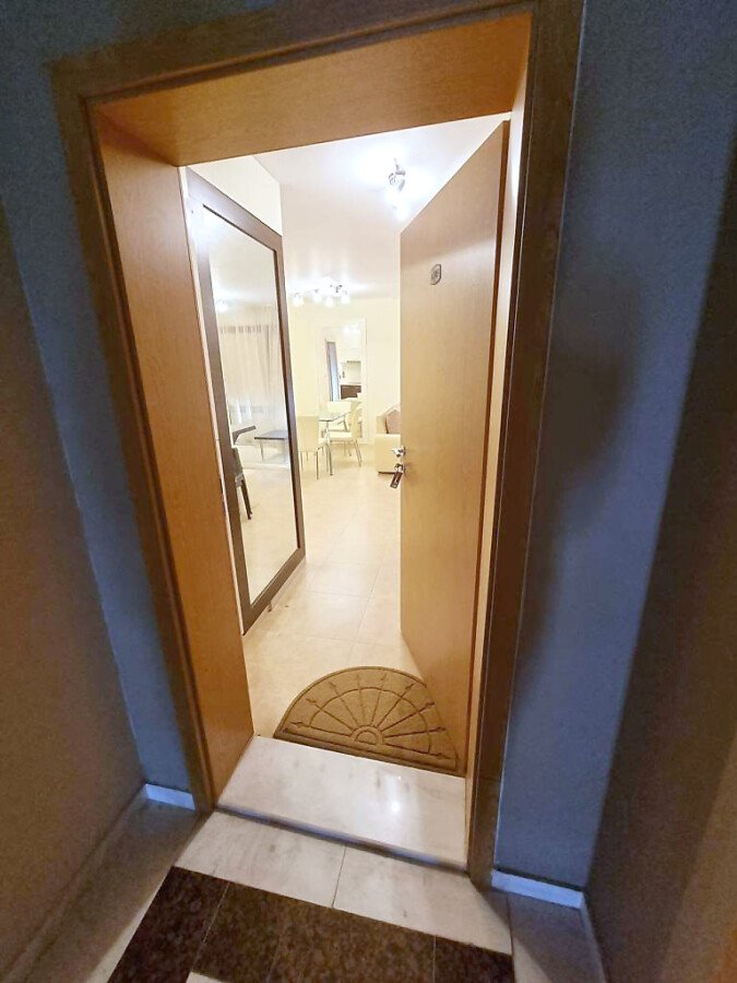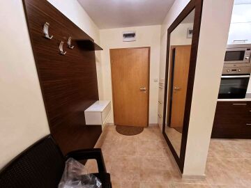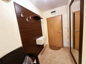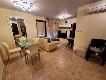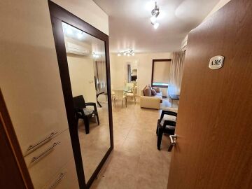Апартаментът е светъл, уютен и просторен. Състои се от входно антре, голяма всекидневна с напълно оборудвана кухня, две спални, баня с тоалетна и тераса с гледка към басейна. Апартаментът е обзаведен стилно, с качествени мебели. Готов е за нанасяне.