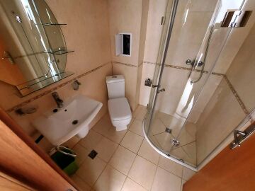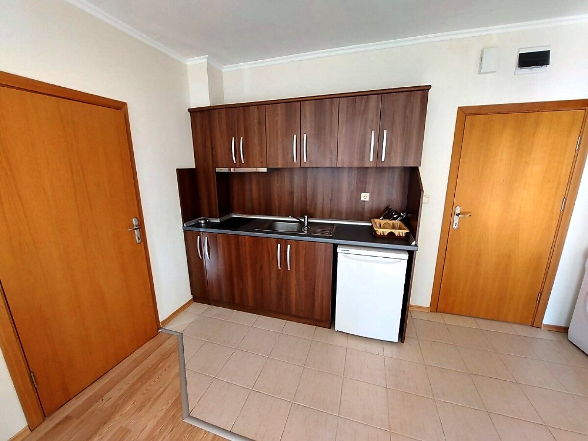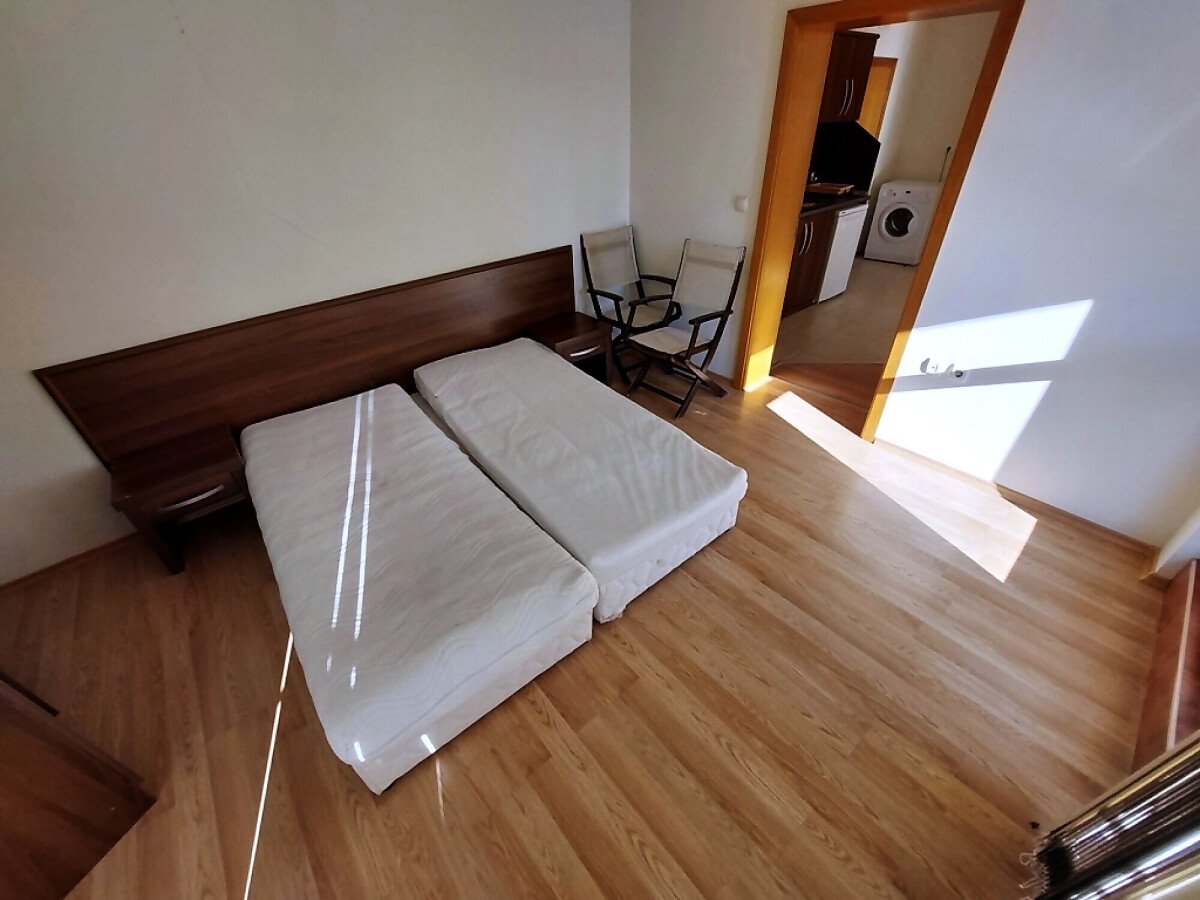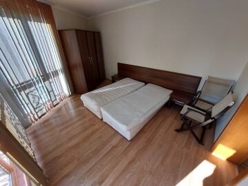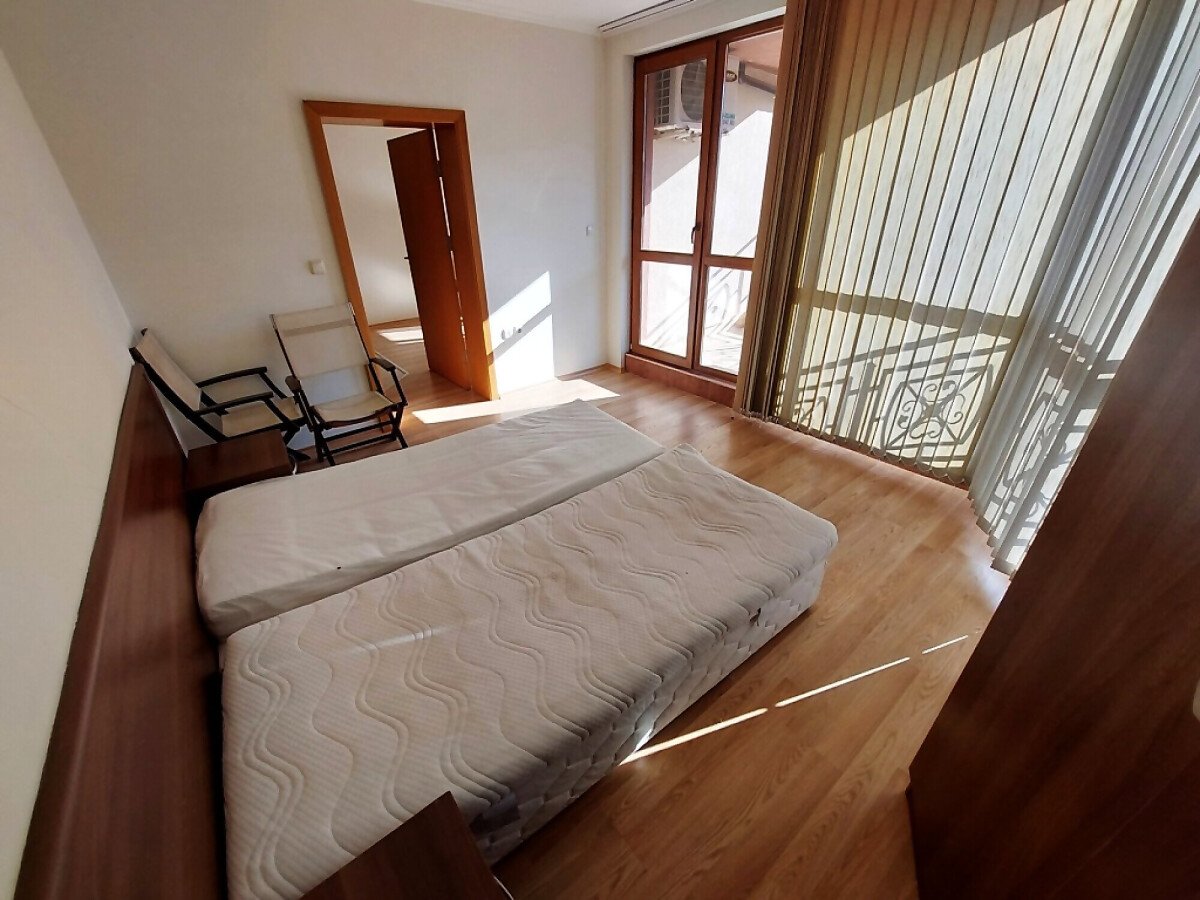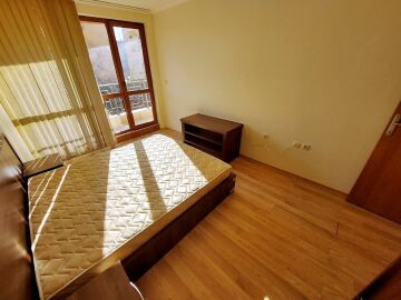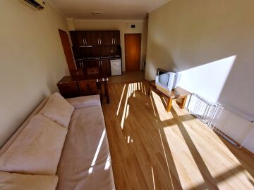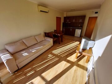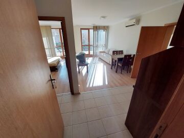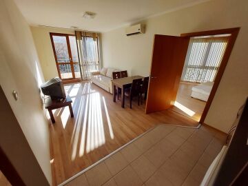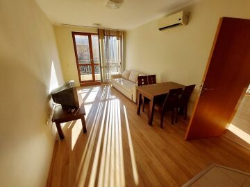 Апартаментът е просторен и светъл, напълно обзаведен и оборудван, готов за нанасяне или отдаване под наем. Състои се от голяма всекидневна с кухненски бокс, две спални, баня с тоалетна, две тераси, едната от които с гледка към басейна.