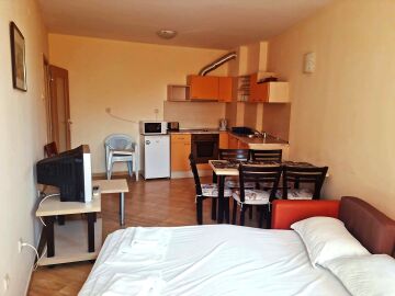Благодарение на добре развитата инфраструктура на района, имотът е подходящ както за отдих и отдаване под наем, така и за целогодишно живеене. В близост има супермаркет, ресторанти, кафенета, банка, аптека, медицински център. Главната пешеходна алея е само на 400 метра разстояние.