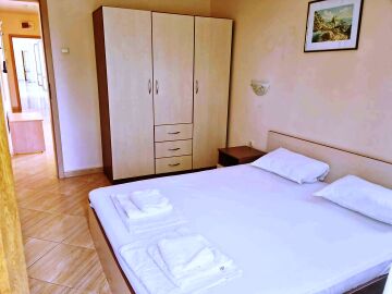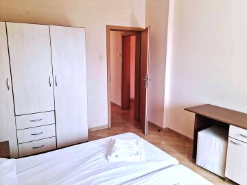 Апартаментът е с площ от 118 кв.м. и има следното разпределение – входно антре, всекидневна с кухненски бокс, две спални, тоалетна, баня с тоалетна и две тераси. Едната от терасите има изглед към басейна.