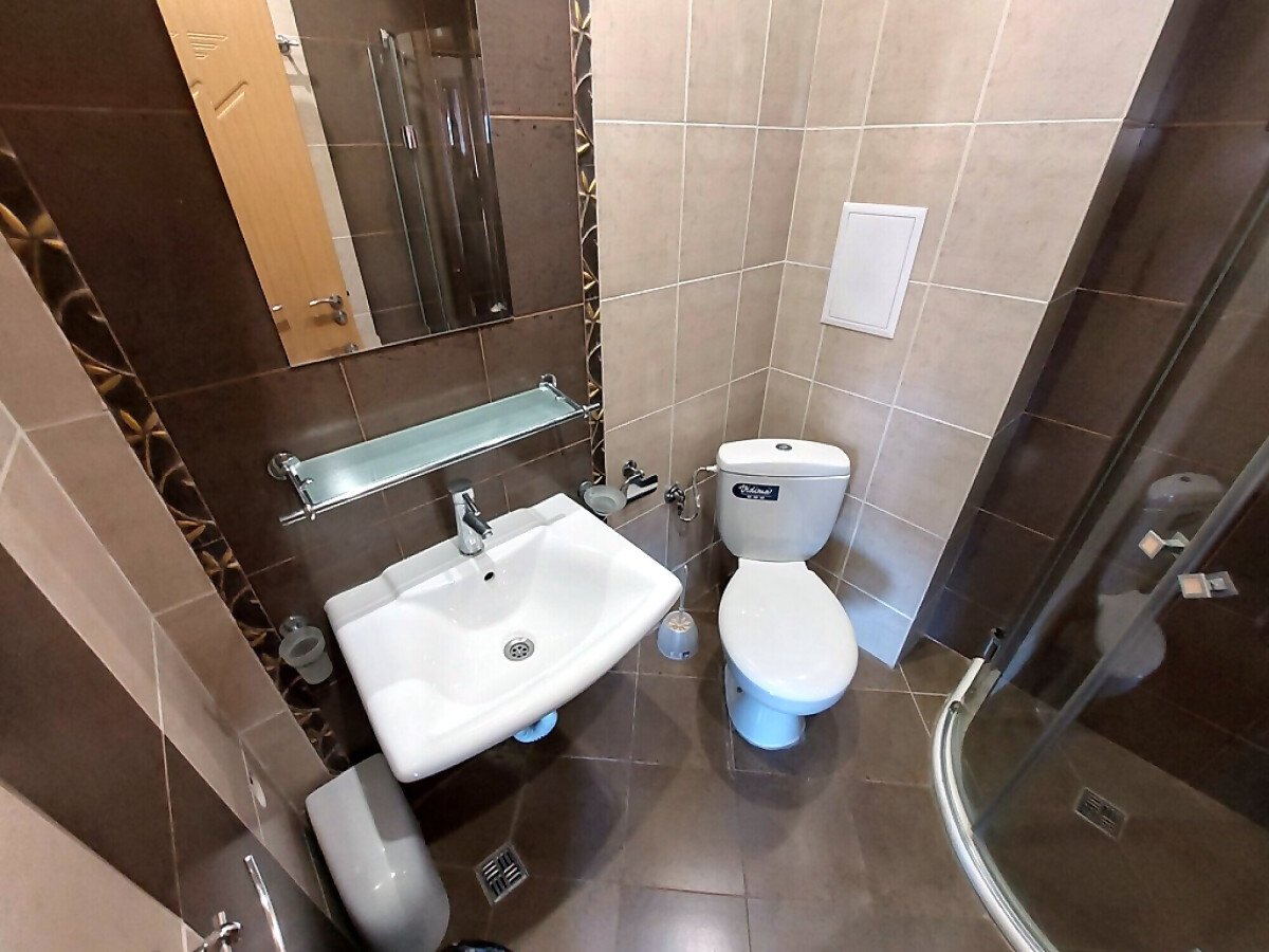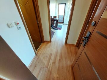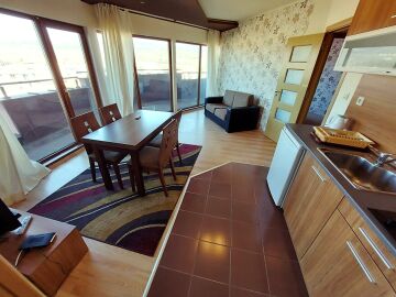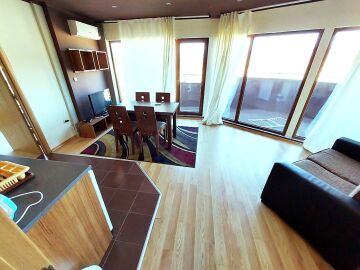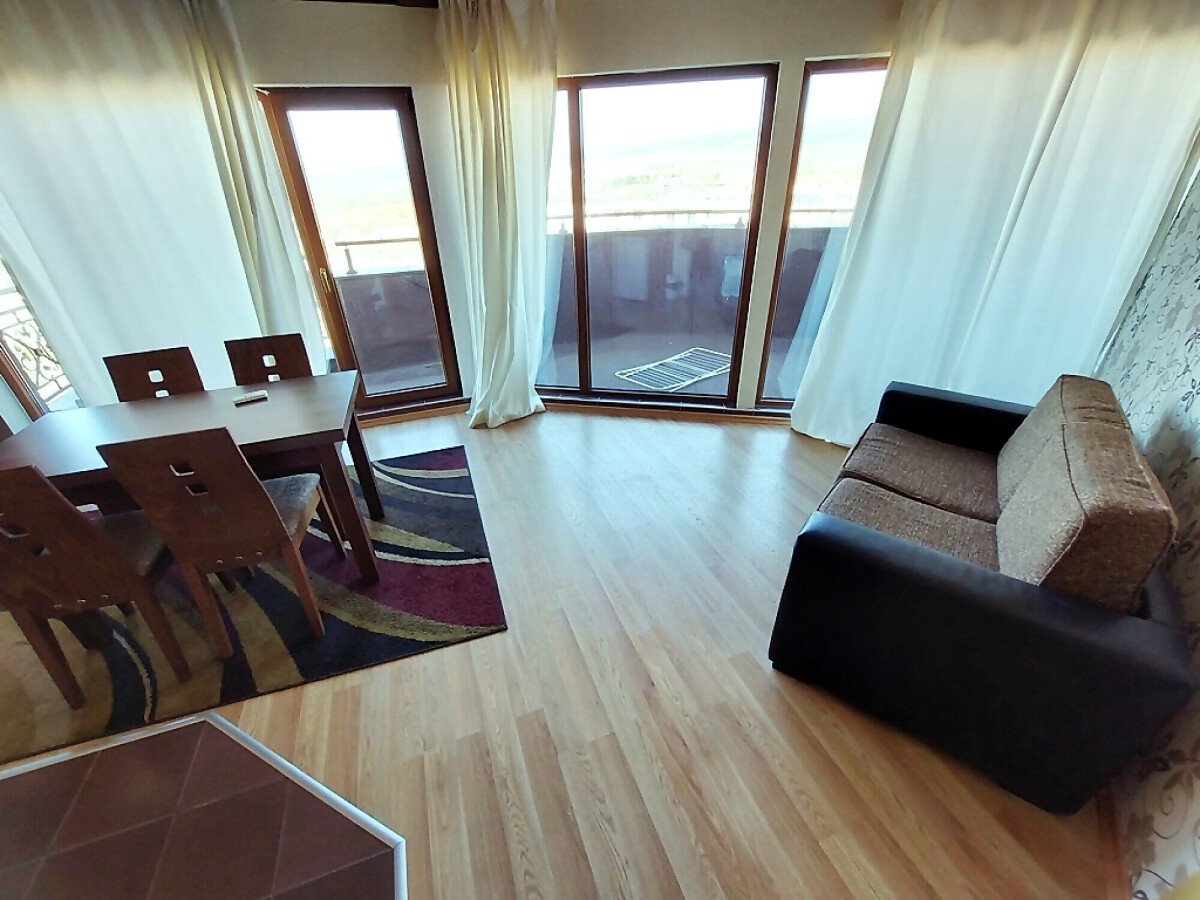 Апартаментът е просторен, стилно обзаведен, разположен на седми етаж. Общата му площ е 86 кв.м. и има следното разпределение – входно антре, всекидневна с кухненски бокс, две спални, баня с тоалетна и голяма тераса с гледка към планината.