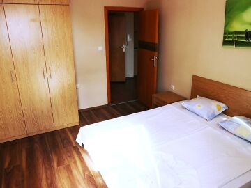 Апартаментът е разположен на шести етаж и има площ 137 кв.м. Състои се просторна всекидневна с кухненски бокс и кът за хранене, две спални, баня с тоалетна и две тераси с прекрасна гледка към басейна. Жилището е напълно обзаведено и оборудвано с необходимите електроуреди за комфортен престой, готово е за нанасяне.