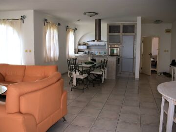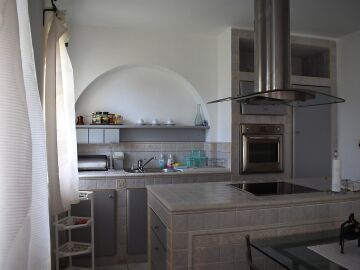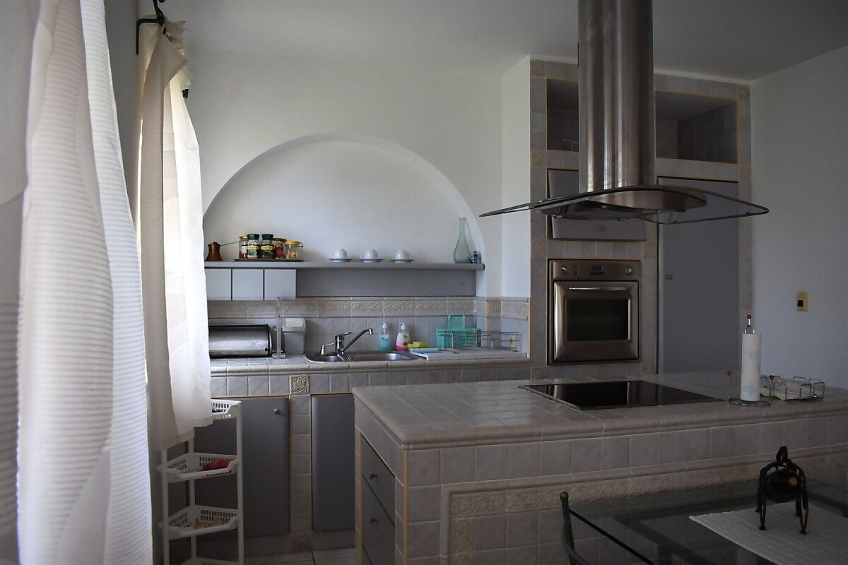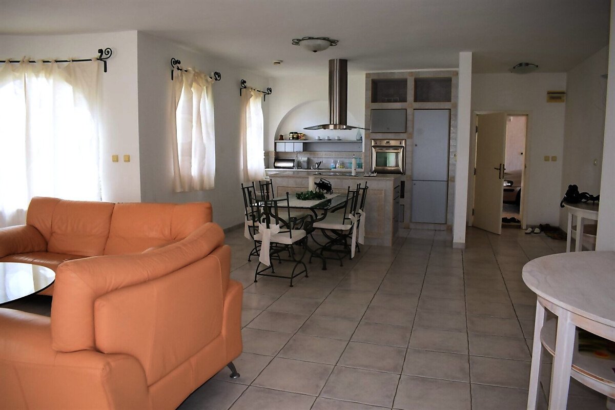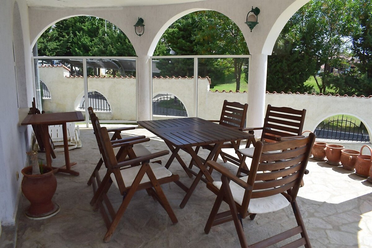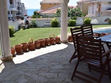 Вилата има покрита овална веранда с прекрасен изглед към морето. От нея има излаз към голям озеленен двор – 1 200 кв.м. и басейн с площ от 64 кв.м. Състои се от входно антре, стилно обзаведена и просторна всекидневна с камина и напълно оборудван кухненски бокс с трапезария, две спални с вградени гардероби от ковано желязо, голяма баня с тоалетна с душ кабина и вана, отделна тоалетна за гости. Всичките помещения са с подове от камък.