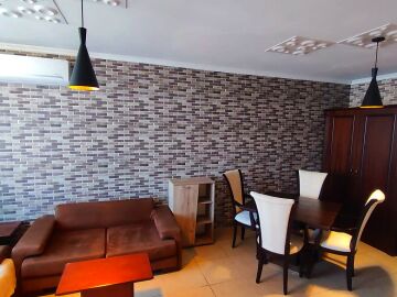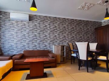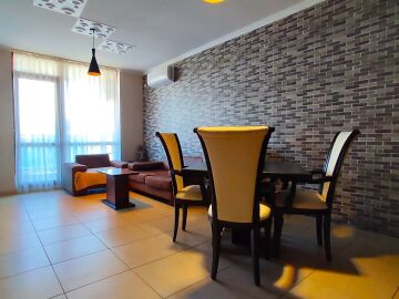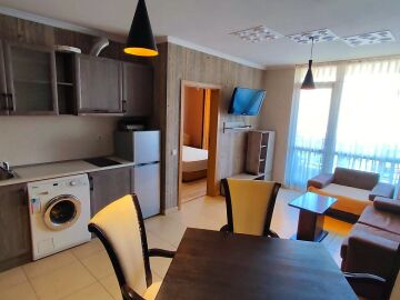 Апартаментът е функционален, напълно обзаведен и оборудван с необходимите електроуреди за комфортен престой или постоянно живеене. Състои се от просторна всекидневна с кухненски бокс, спалня, две бани с тоалетни и тераса.