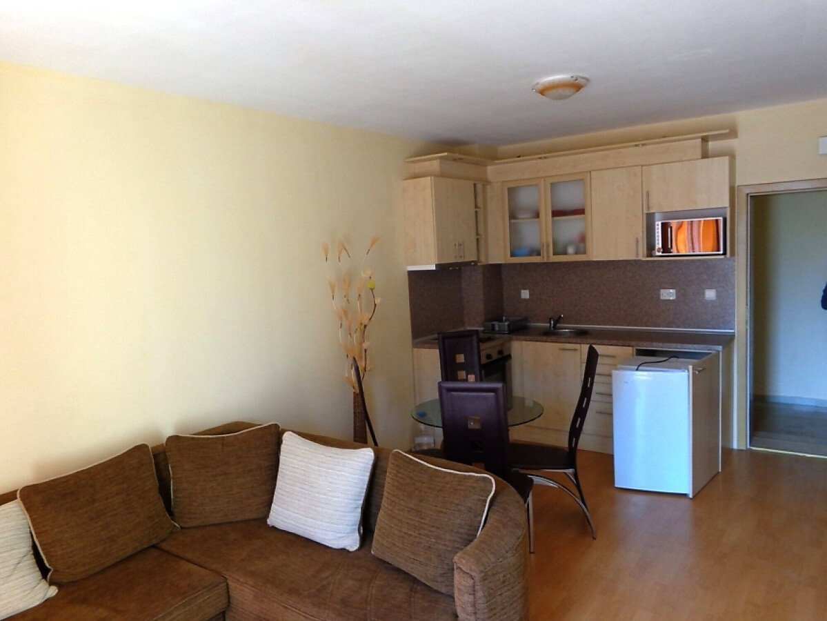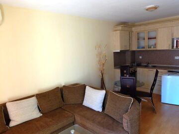 Апартаментът е светъл и функционален. Състои се от просторна всекидневна с кухненски бокс, спалня, баня с тоалетна и тераса със странична гледка към морето и басейна. И от двете стаи има излаз към терасата.
