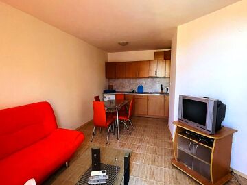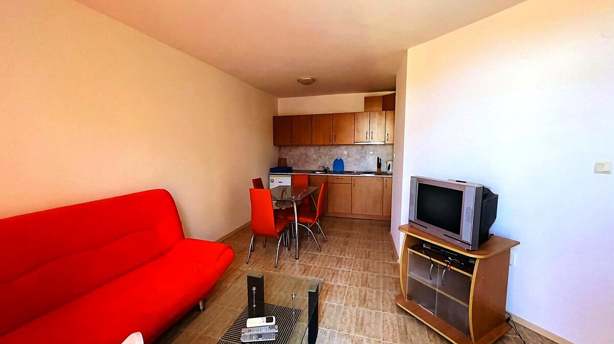 Апартаментът е функционален, напълно обзаведен и оборудван с всички необходими електроуреди, готов за нанасяне. Състои се от входно антре, просторна всекидневна с кухненски бокс и кът за хранене, спалня, баня с тоалетна и голяма тераса с красива гледка към басейна.