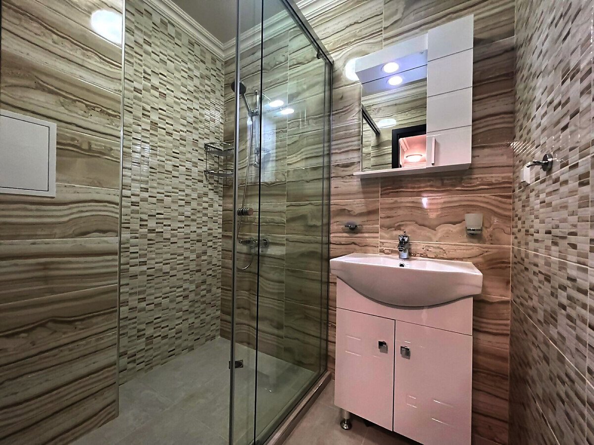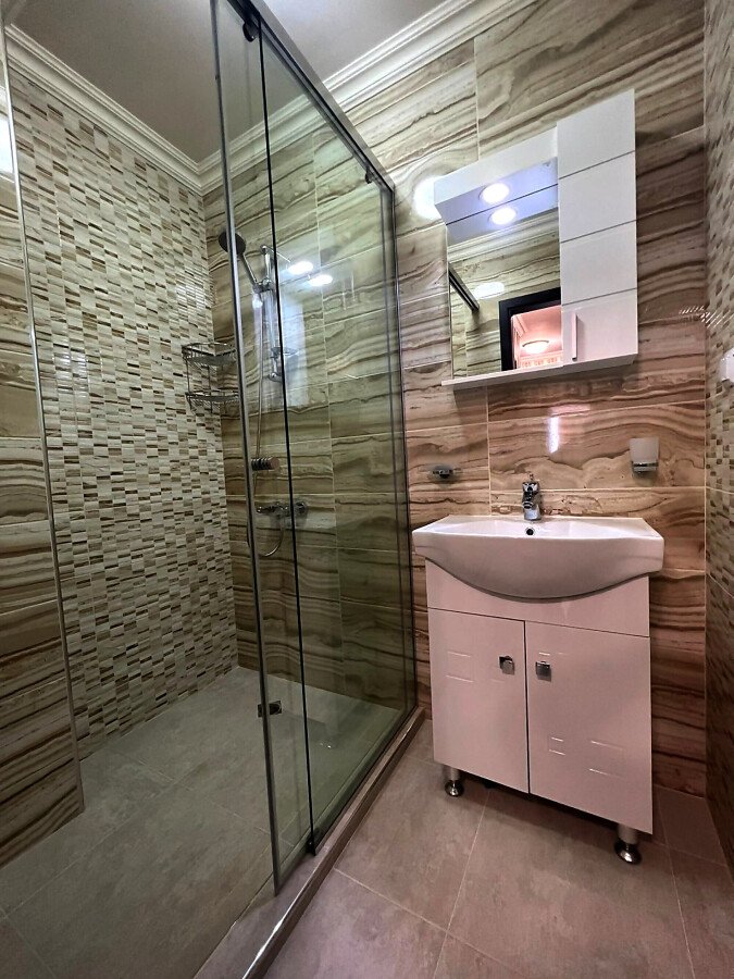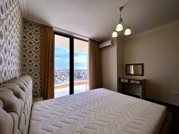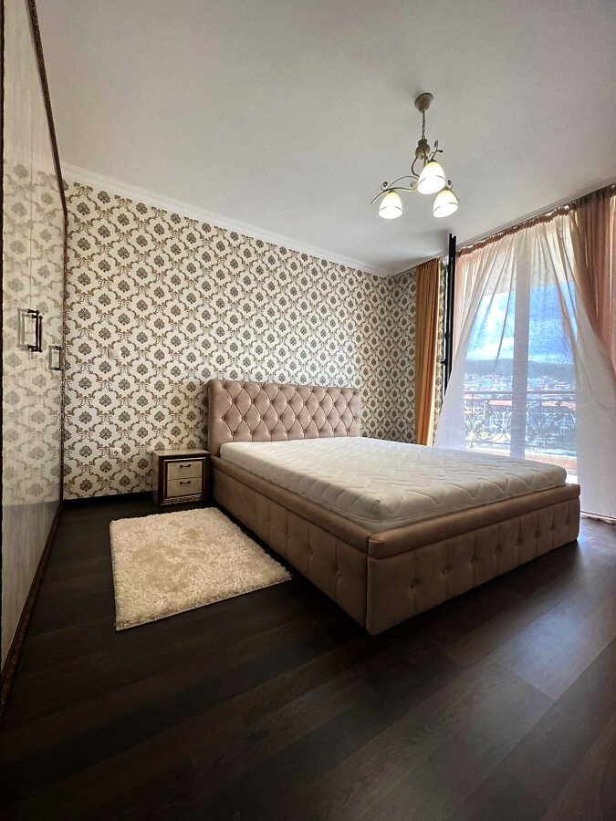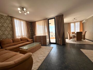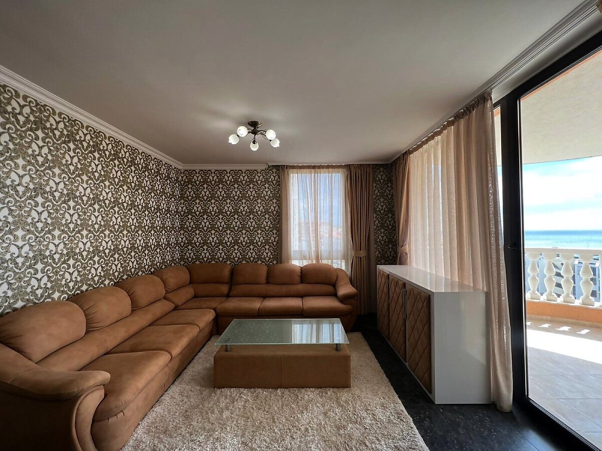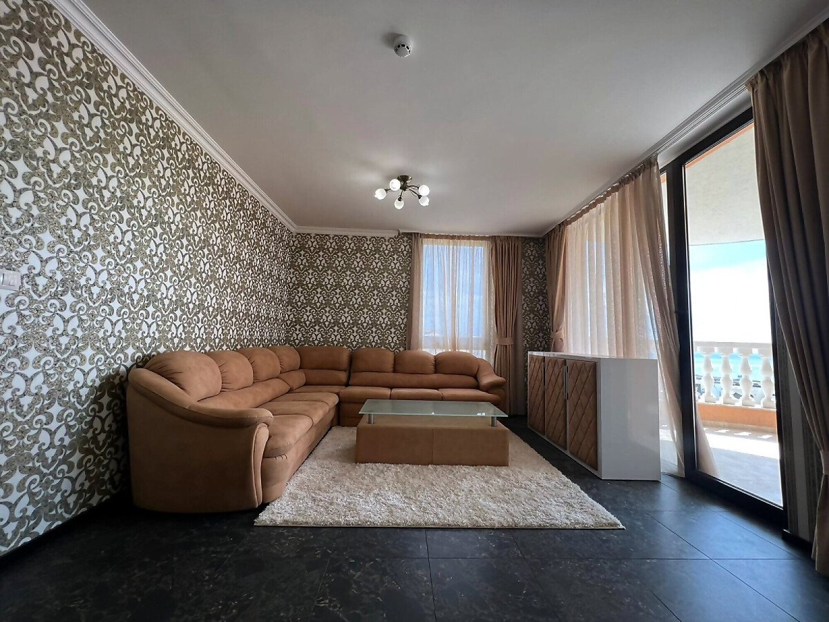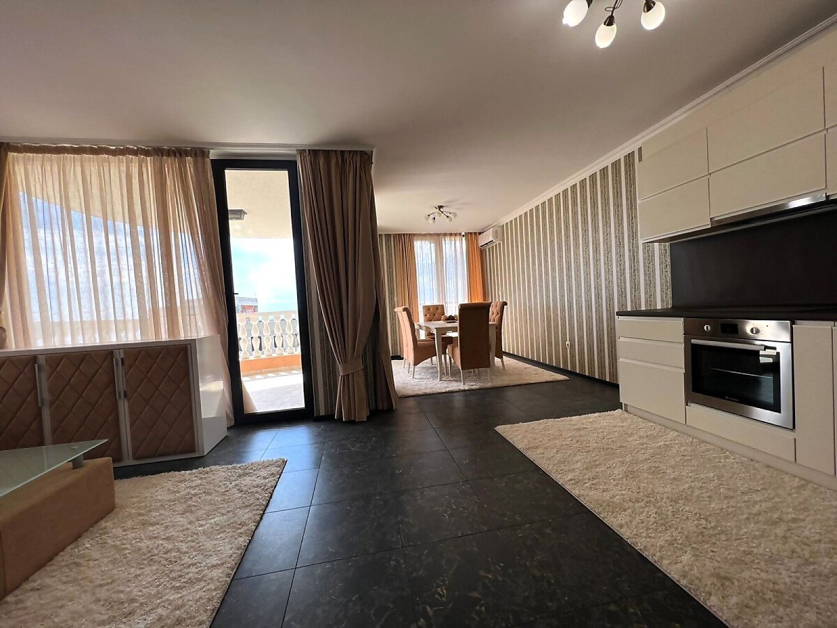 Апартаментът е стилно обзаведен, разполага с цялостно подово отопление. Състои се от входно антре, просторна всекидневна с кухненски бокс и кът за хранене, две спални, две бани с тоалетна и голяма тераса с невероятна гледка към морето и планината.