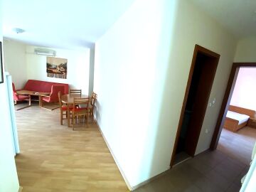 Апартаментът е изцяло оборудван, разполага с просторна всекидневна, три спални, две бани и огромна тераса с панорамна гледка към планини и море.