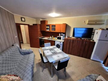 Апартаментът е напълно обзаведен, разполага с антре, всекидневна, спалня, баня и чудесна тераса с гледка към пътя и чудесна градина.