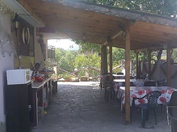 Територията на къщата е богато озеленена и разполага с голям паркинг, зона за барбекю, навес с кухненски бокс и маси със столове.