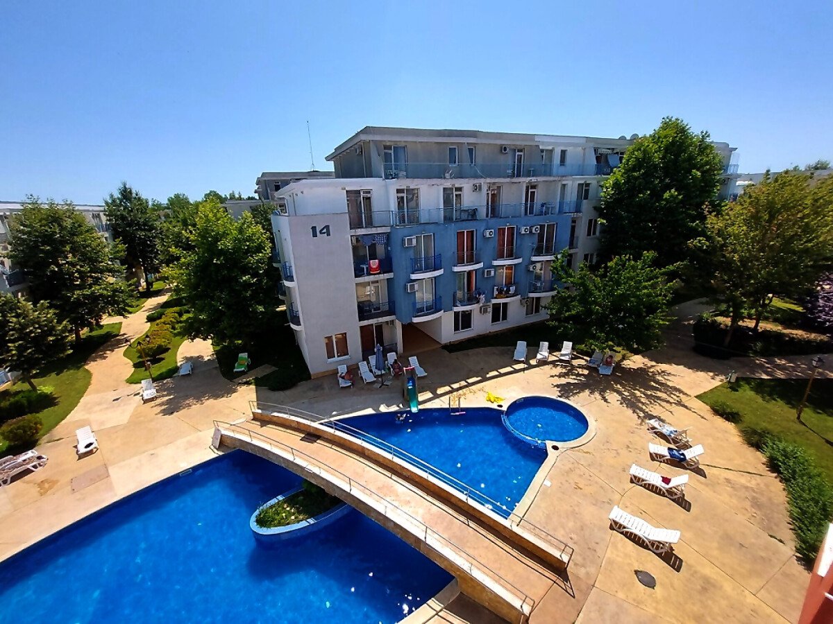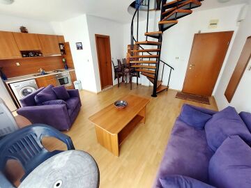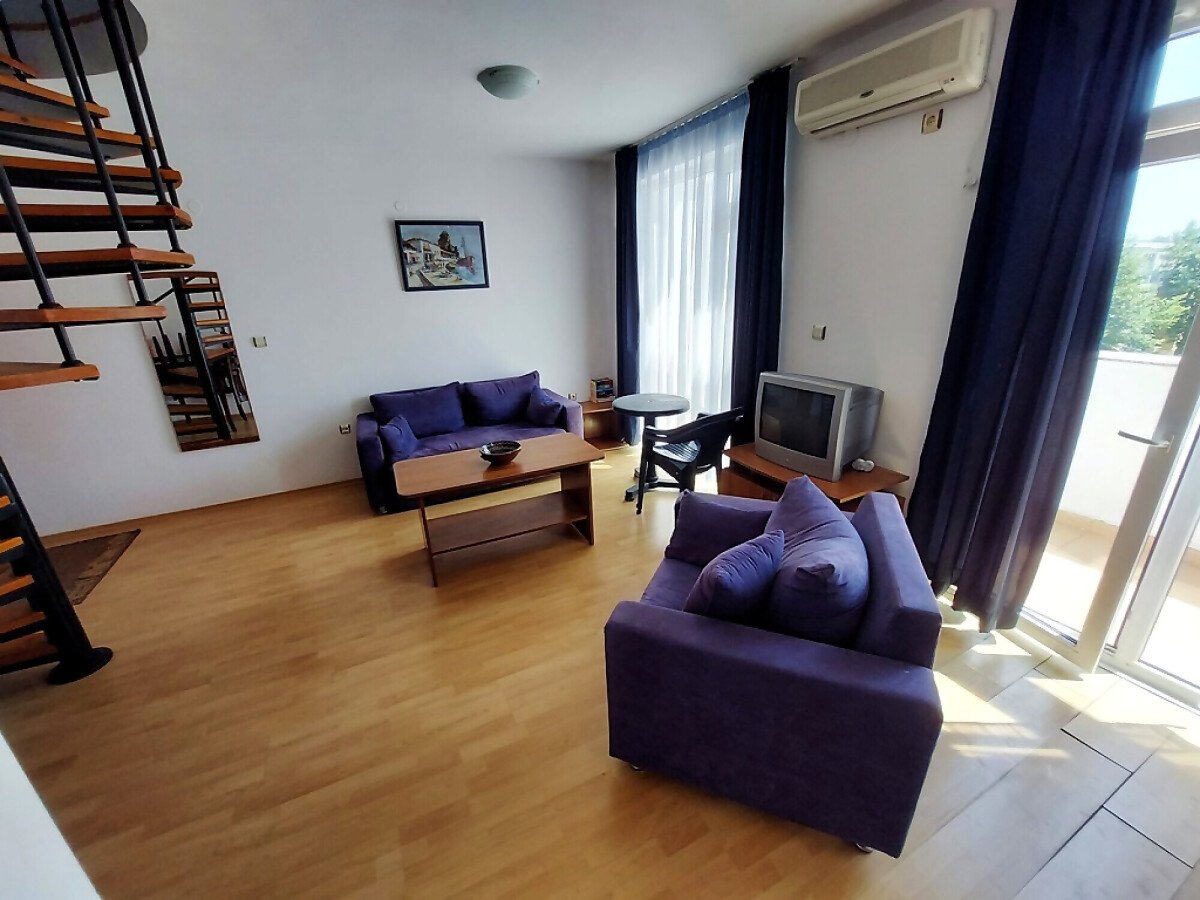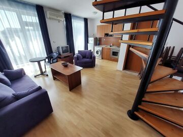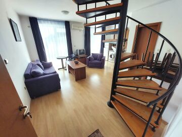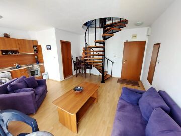 BG Properties Invest Ви предлага чудесен мезонет в луксозния комплекс SunnyDay 3 само на 5 минути пеша от красивите брегове на Слънчев бряг. Комплексът разполага с открит плувен басейн с децки кът, бар и градина и безплатен паркинг. На близо се намира тенис корт, пешеходен туризъм, риболов и аквапарк. Апартаментът се намира на четвъртия етаж и е с площ от 113 кв м. Състои се от два етажа. Първия етаж разполага с просторна всекидневна с кухненски блок, баня. Втория етаж разполага с две спални с чудесна тераса с гледка към басейна.