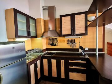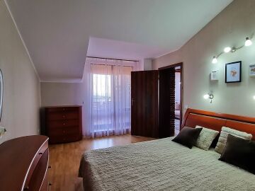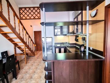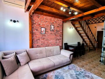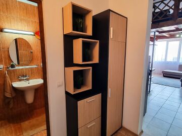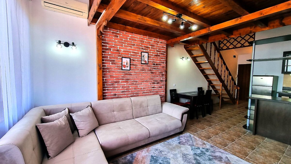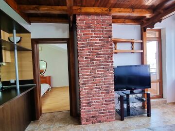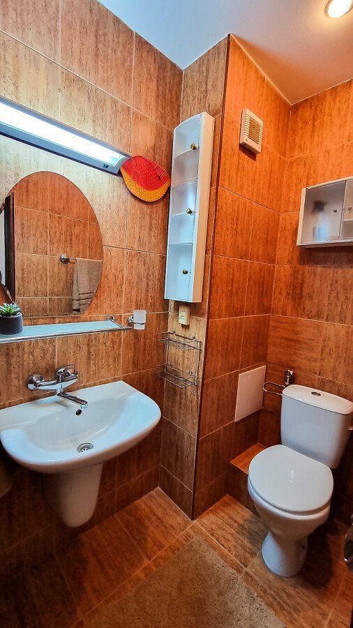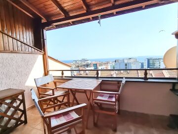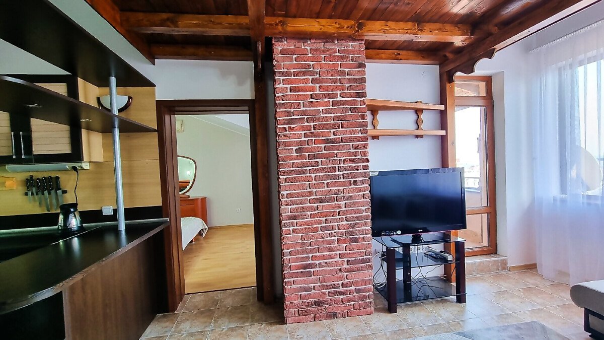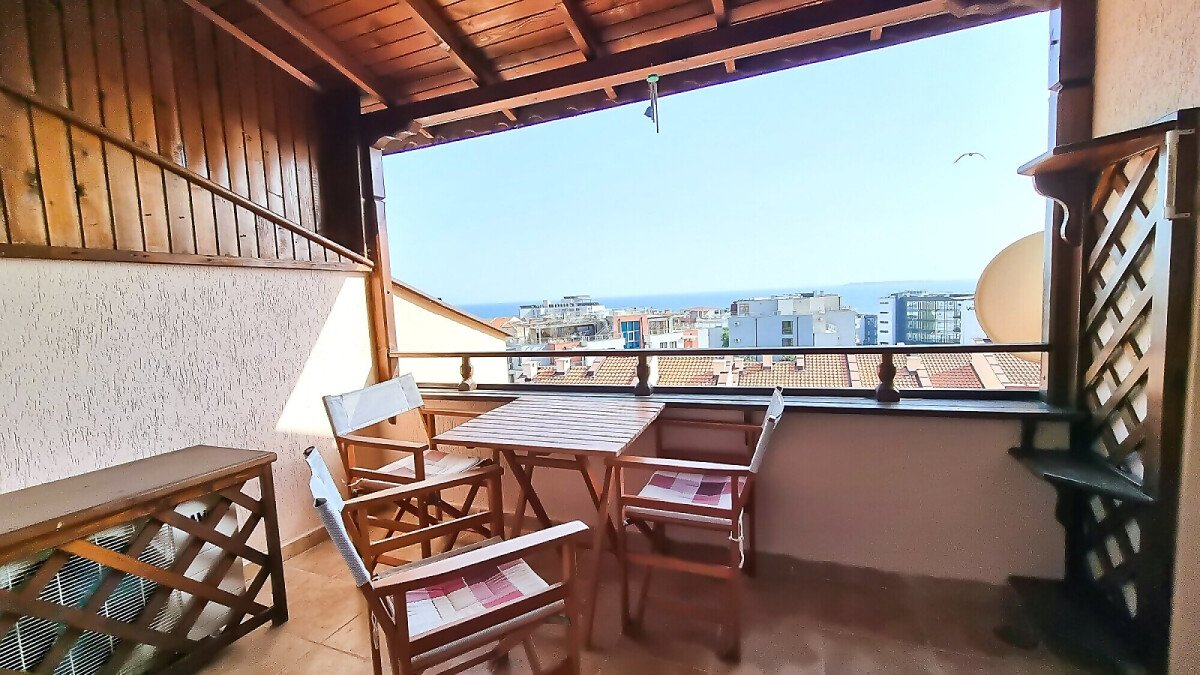 Апартаментът е расположен на 4 етаж и е с площ от 82кв.м., състои се от голяма всекидневна с кухненски блок, две спални, баня и чудесна тераса с гледка към море.