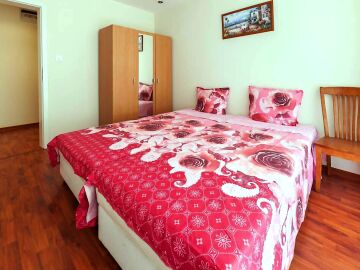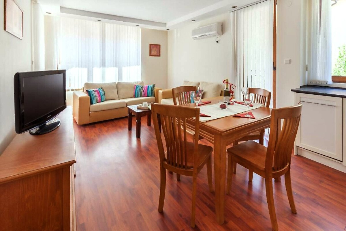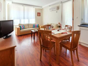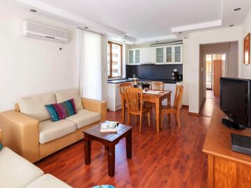 Апартаментът се намира на втори етаж и е с площ от 86 кв. м., състои се от всекидневна с кухненски блок, две спални, баня и чудесна тераса.