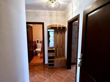 Жилището е разположено на трети жилищен етаж, а разпределението е следното - антре, светла всекидневна с кухненски бокс и кът за хранене, две спални, балкон с гледка към градината, баня с тоалетна и душ кабина. Имотът се продава напълно обзаведен и оборудван.